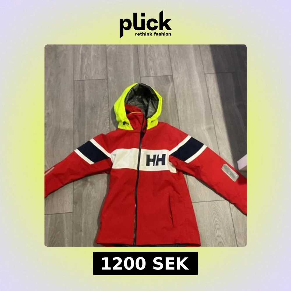Säljer en röd jacka från Helly Hansen med en iögonfallande gul huva och marinblå detaljer. Jackan har en dragkedja framtill och långa ärmar med vita och blå ränder. Perfekt för kyliga dagar. OBS katt finns i hemmet pris kan diskuteras