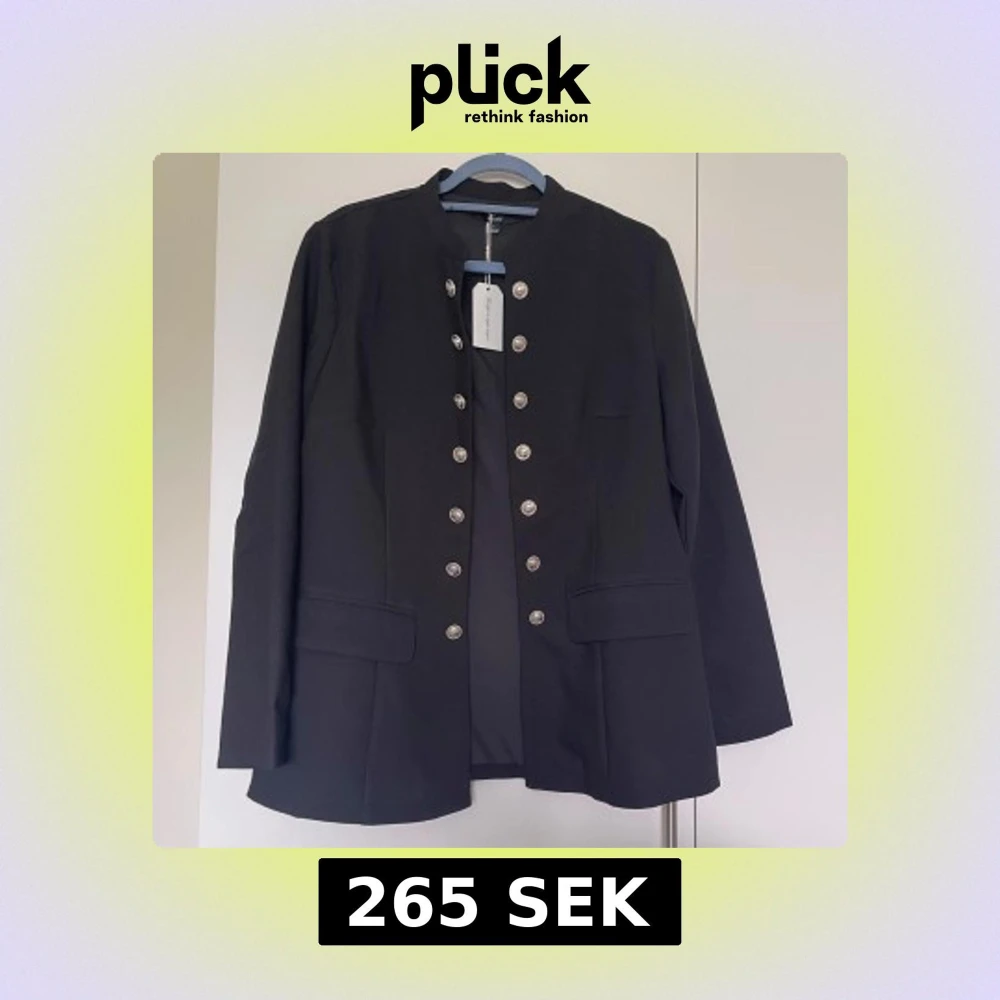 Stilren svart kavaj med raka linjer och dekorativa silverknappar framtill. Jackan har två falska fickor med lock och en kraglös design som ger en modern touch. Perfekt för dig som gillar en clean och snygg look.Helt ny med etikett