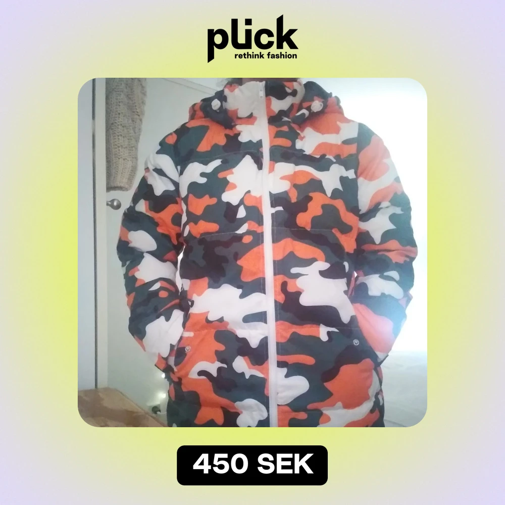 HELT NY & OANVÄND cool camouflage jacka / vinterjacka, Strlk: Medium/38-40. Vit/grön/orange. Vadderad och varm med fickor och luva. Fickorna stängs med lock och har tryckknapp på varje. Har pytteliten defekt framtill i form av blå liten prick från bläckpenna, syns knappt - se bilder, tex sista bilden.