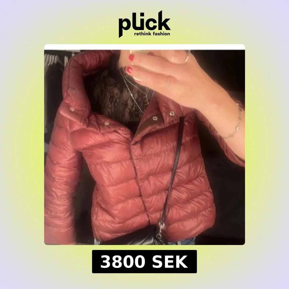 Säljer en vinröd pufferjacka med hög krage och tryckknappar. Jackan har en boxig passform och är quiltad med horisontella sömmar. Materialet är glansigt och lätt, perfekt för kyliga dagar. Ärmarna är något kortare och jackan har en clean look utan synliga loggor.