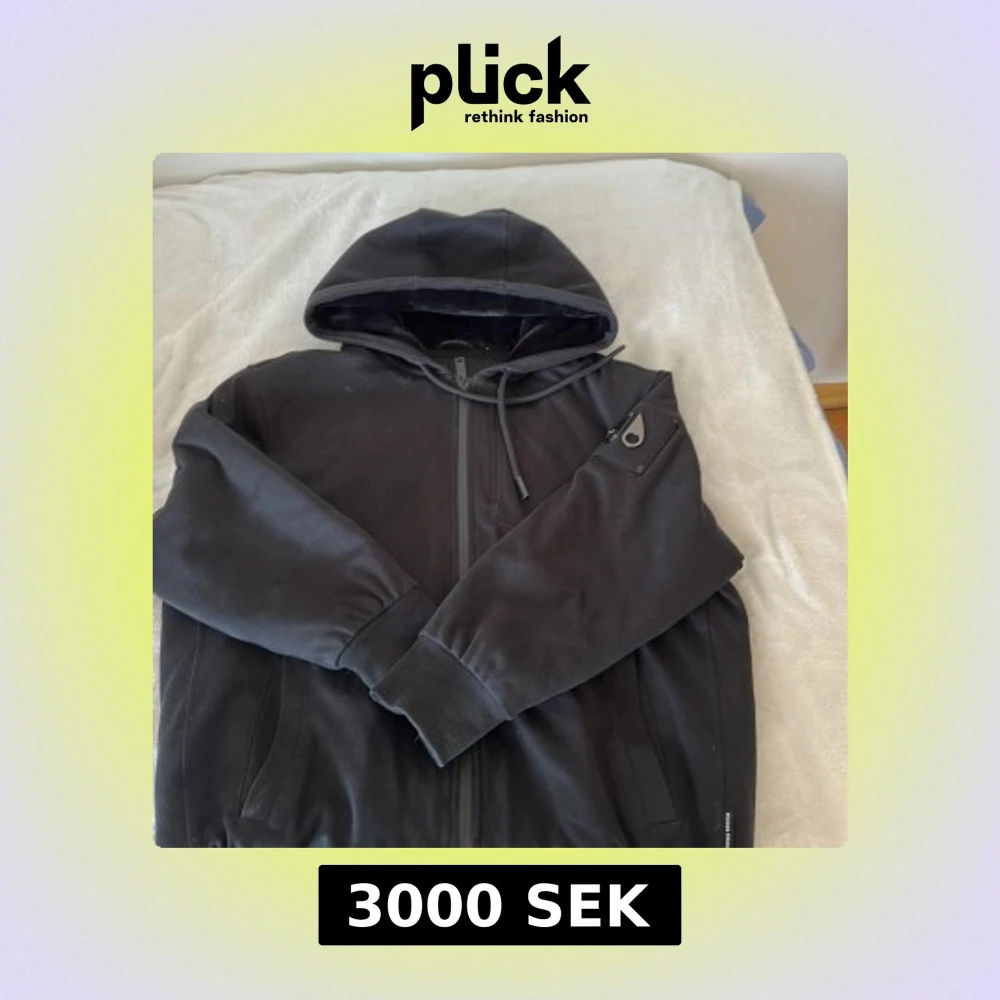 Säljer en svart hoodiejacka från Moose Knuckles med dragkedja och huva. Jackan har en metallogo på ärmen och ribbade muddar. Insidan är quiltad för extra komfort och värme. Perfekt för kyliga dagar.