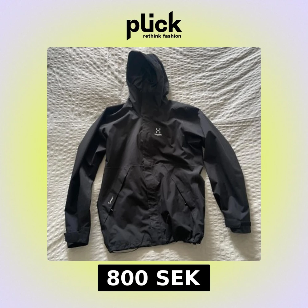 Säljer en svart vindjacka Haglöfs med huva och dragkedja framtill. Jackan har två stora fickor med dragkedja och justerbara ärmslut. Perfekt för utomhusaktiviteter och skyddar mot vind och regn.