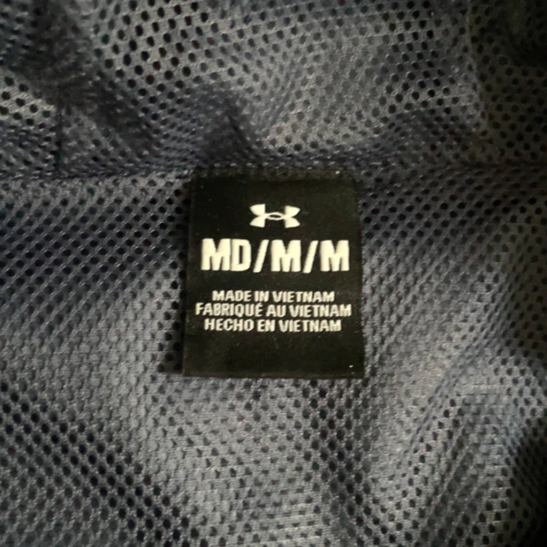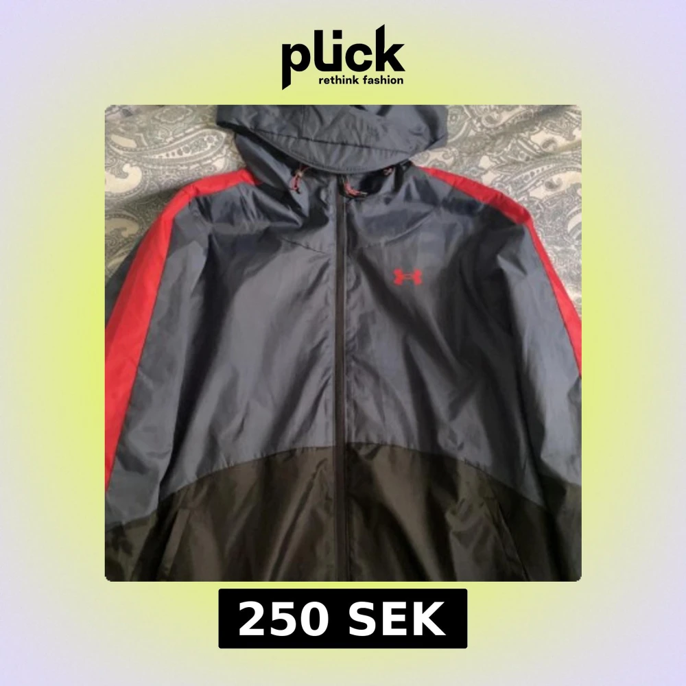 Säljer en snygg vindjacka från Under Armour i svart och grått med röda detaljer och logga. Jackan har huva, dragkedja och ribbade muddar. Perfekt för träning eller utomhusaktiviteter.