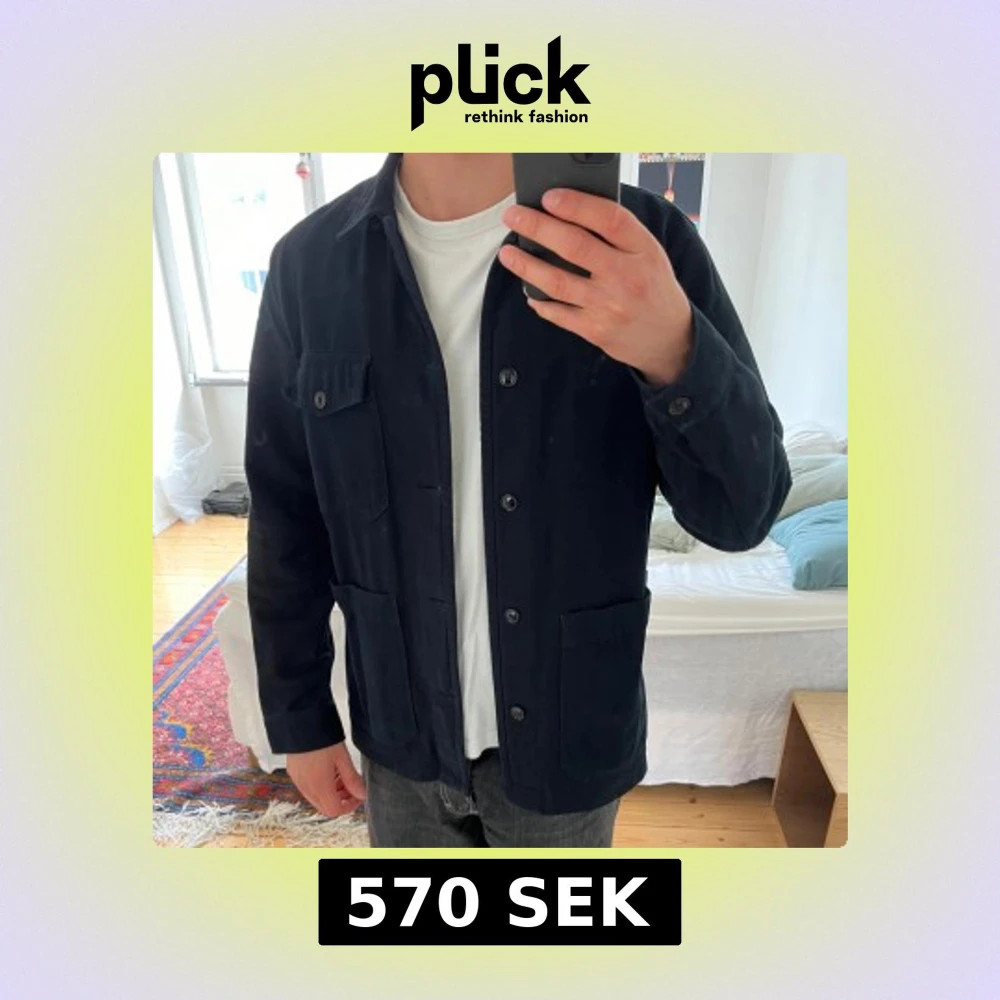 Säljer en mörkblå overshirt från A Day's March i kraftig bomull. Jackan har knäppning framtill, tre fickor på framsidan och klassisk krage. Den saknar en knapp på ena ärmen. Extra knappar finns dock på insidan av jackan.