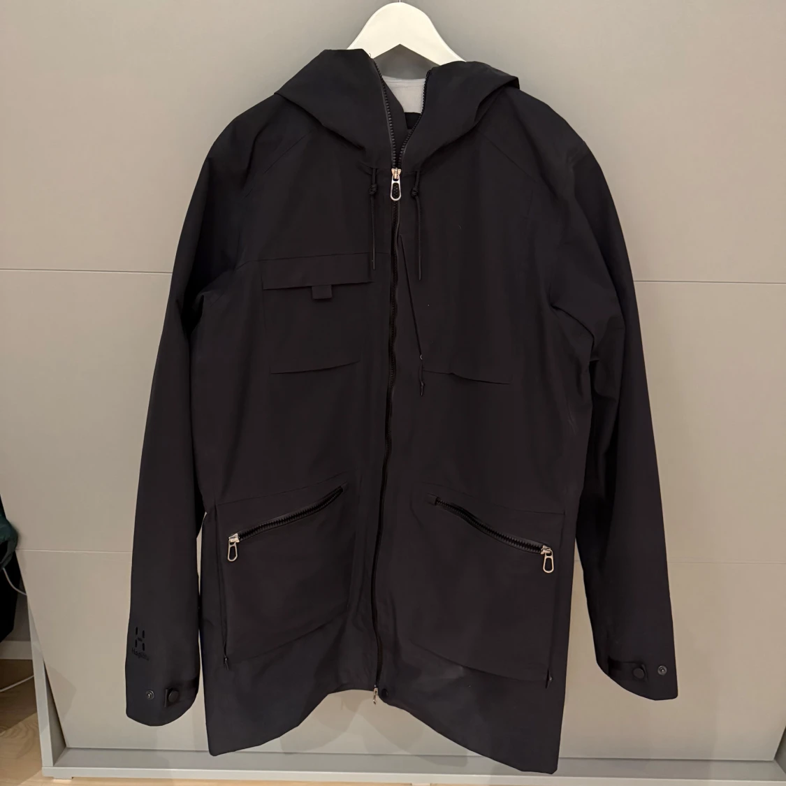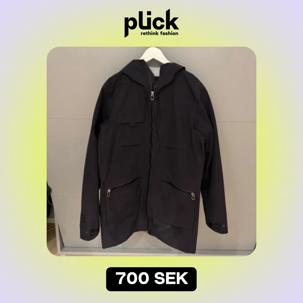 Säljer en svart vindjacka från Haglöfs i storlek M. Jackan har en praktisk huva och dragkedja framtill. Perfekt för blåsiga dagar och har en stilren design med två fickor med dragkedjor. Passar bra för både vardag och utomhusaktiviteter.