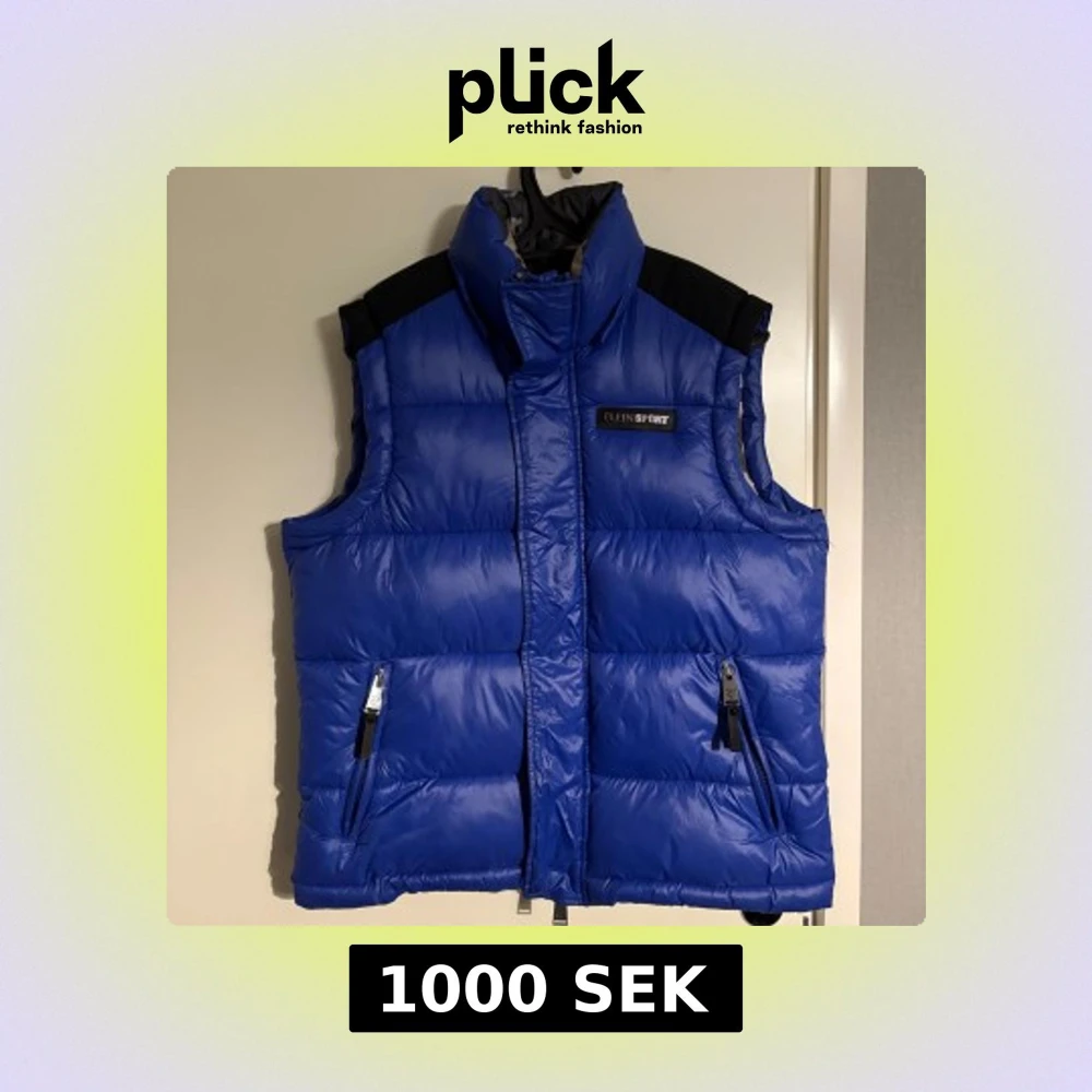 Säljer en blå dunväst från Plein Sport med svart axelparti och dragkedja. Västen har ett stort silverfärgat tigertryck på ryggen och en camouflagemönstrad insida. Sparsamt använd.