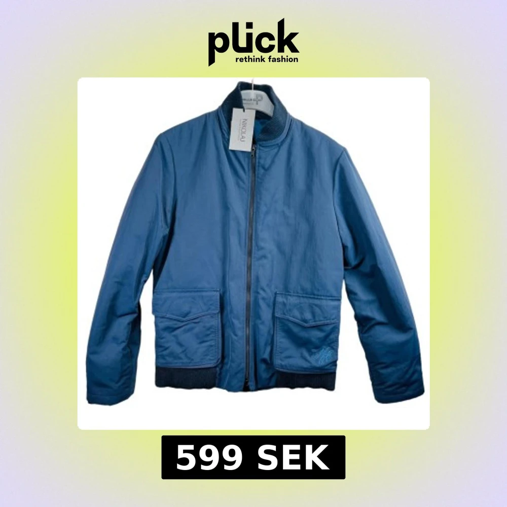 Snygg blå bomberjacka från Nikolaj d'Étoiles med dragkedja framtill, två stora fickor med lock och broderad logga på ena fickan. Jackan har ribbade muddar vid krage, ärmslut och nederkant samt ett glansigt innerfoder med röda detaljer.