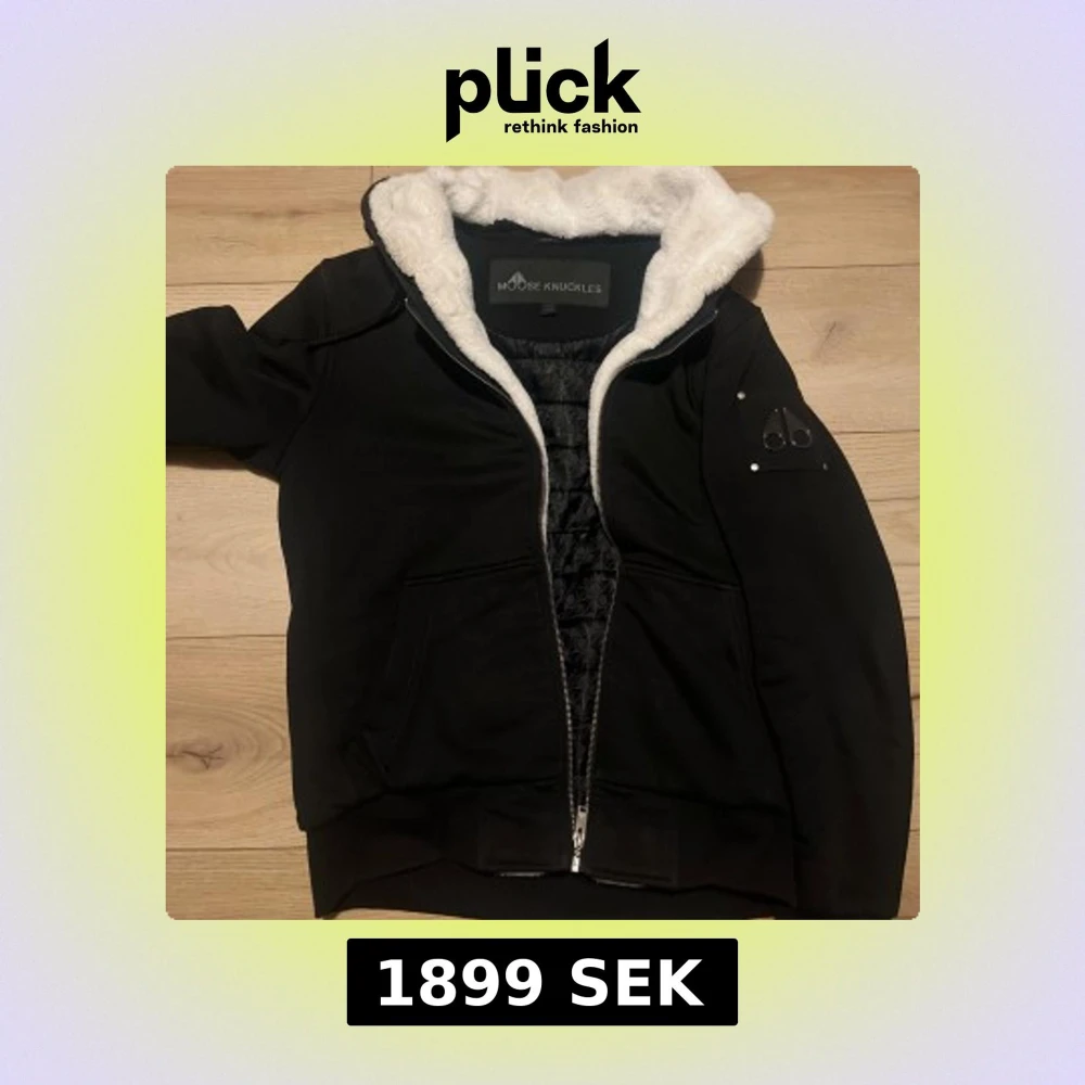 Säljer en svart jacka från Moose Knuckles med vit fluffig huva och quiltat innerfoder. Jackan har dragkedja framtill och en logotyp i metall på ärmen. Perfekt för kyligare dagar och har en modern look.