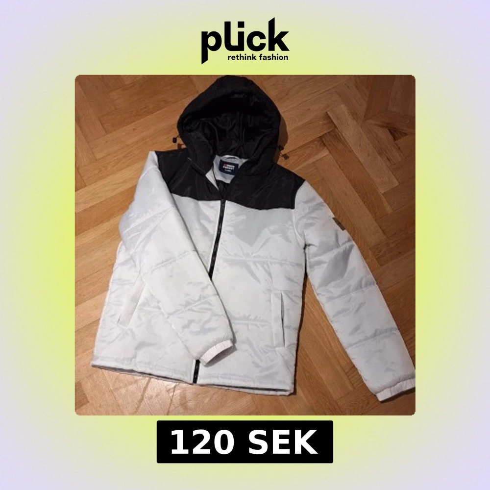 Säljer en snygg vit och svart jacka från Denim Project i storlek XL. Jackan har en dragkedja framtill och en huva för extra skydd. Perfekt för kyligare dagar med sin stilrena design.