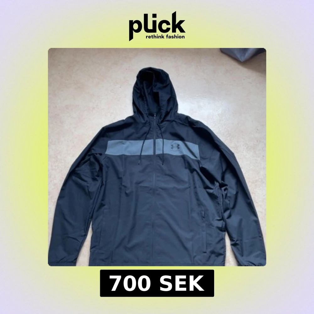 Säljer en svart vindjacka från Under Armour med grå detaljer. Jackan har en huva och dragkedja framtill. Perfekt för blåsiga dagar och har en loose passform för extra komfort.