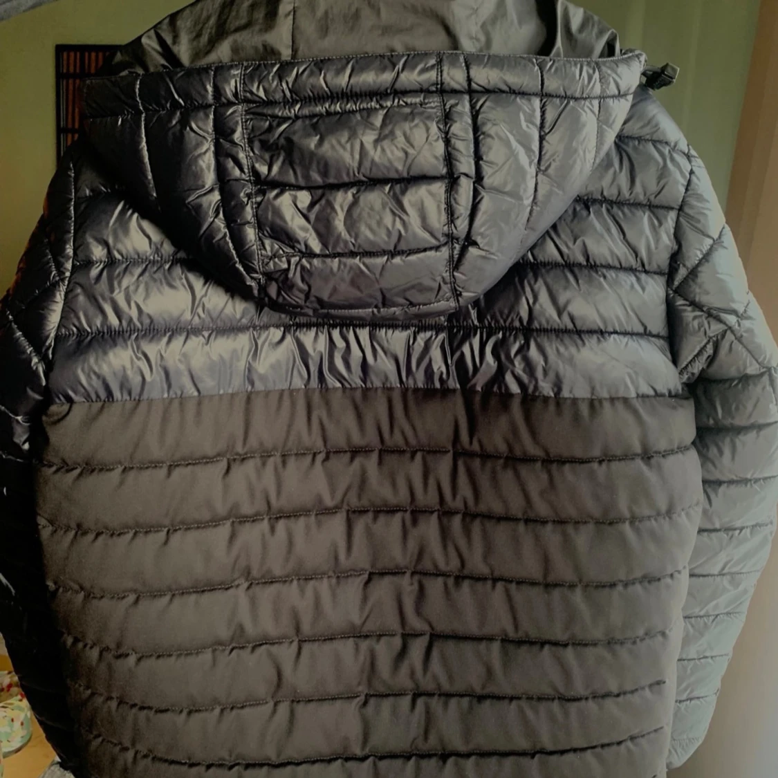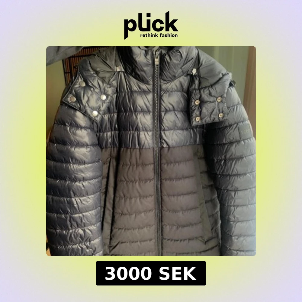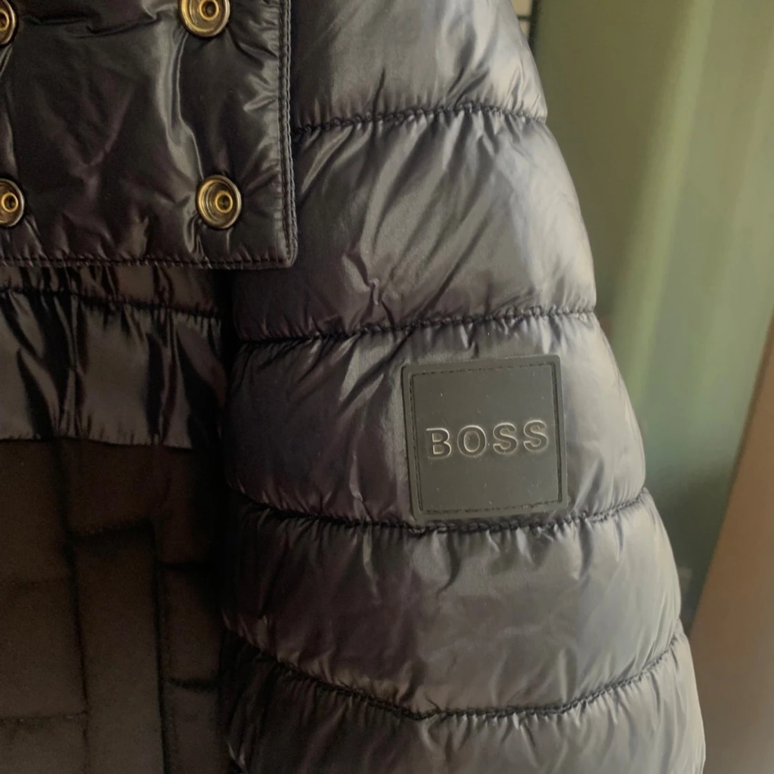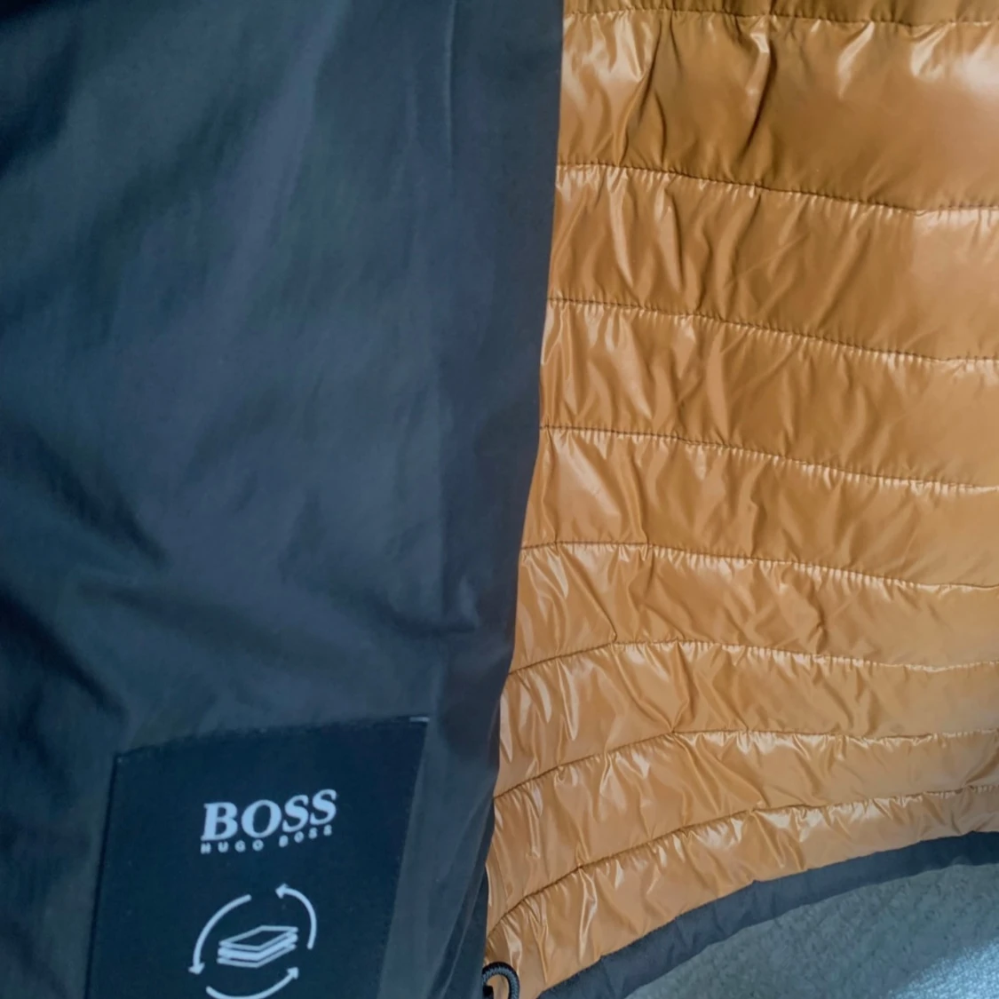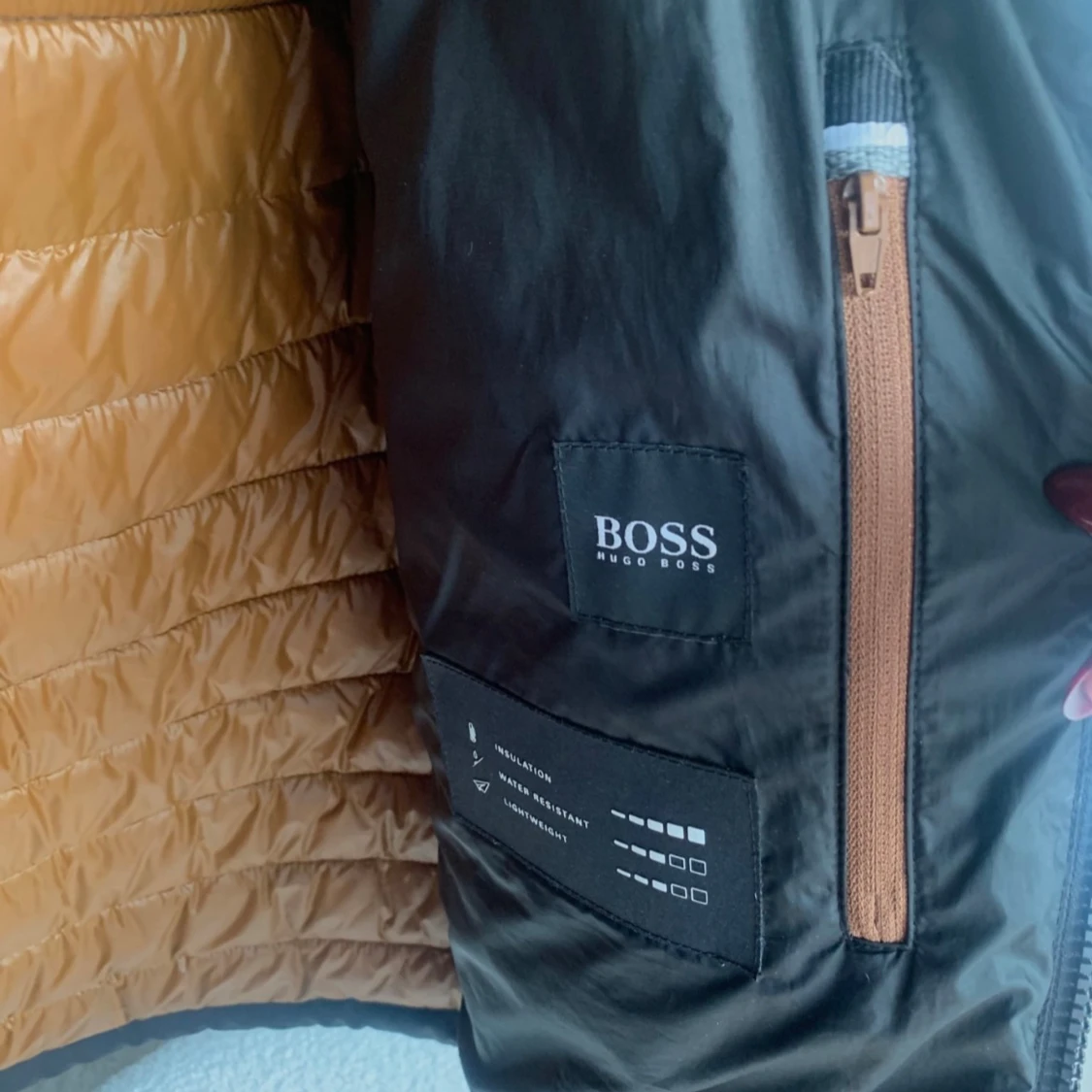 Snygg svart pufferjacka från BOSS med snygg design, hög krage och avtagbar huva. Jackan har dragkedja framtill, tryckknappar på axlarna och diskret BOSS-logga på ärmen. Insidan är fodrad i guldbrun färg för extra stilpoäng. Använd men i mycket gott skick.