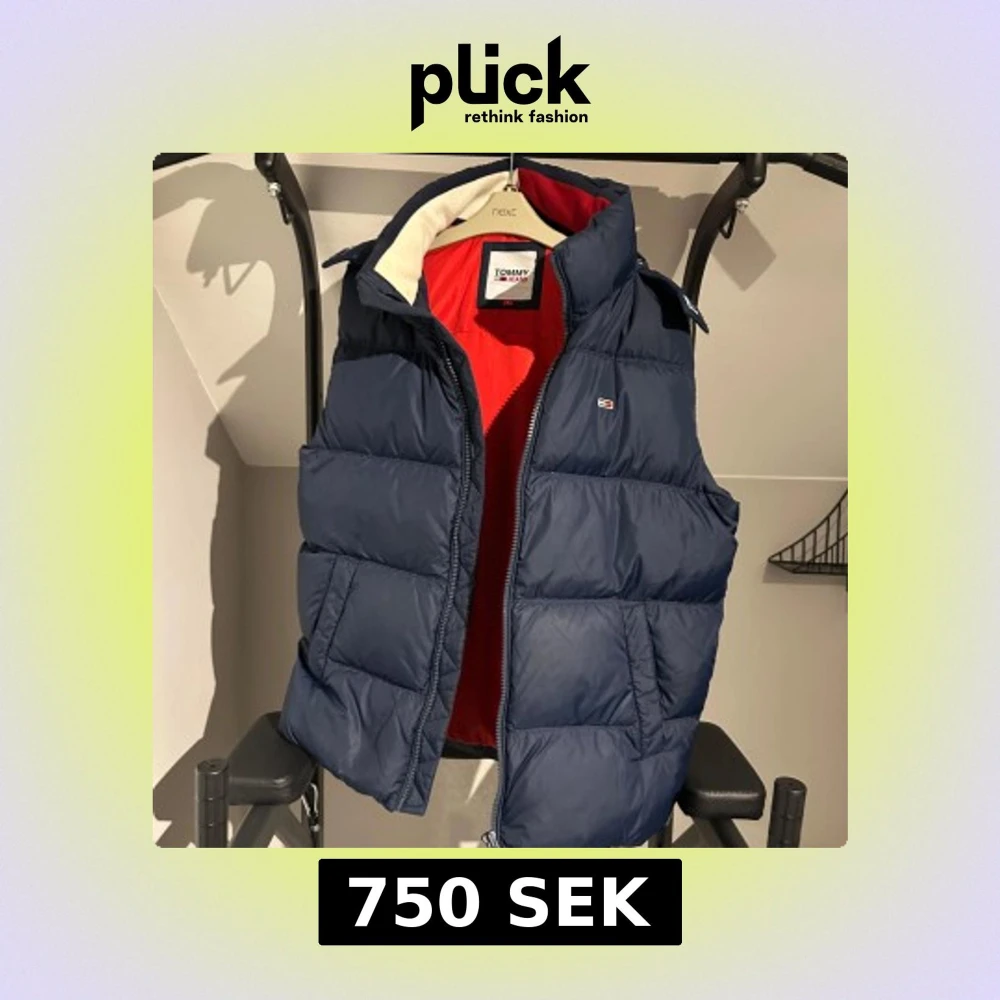 Snygg mörkblå dunväst från Tommy Jeans med röd insida och huva. Västen har quiltad design, dragkedja framtill och två stora fickor. Perfekt för lager-på-lager och ger en sportig vibe. Klassisk logga på bröstet och cool kontrast mellan färgerna.