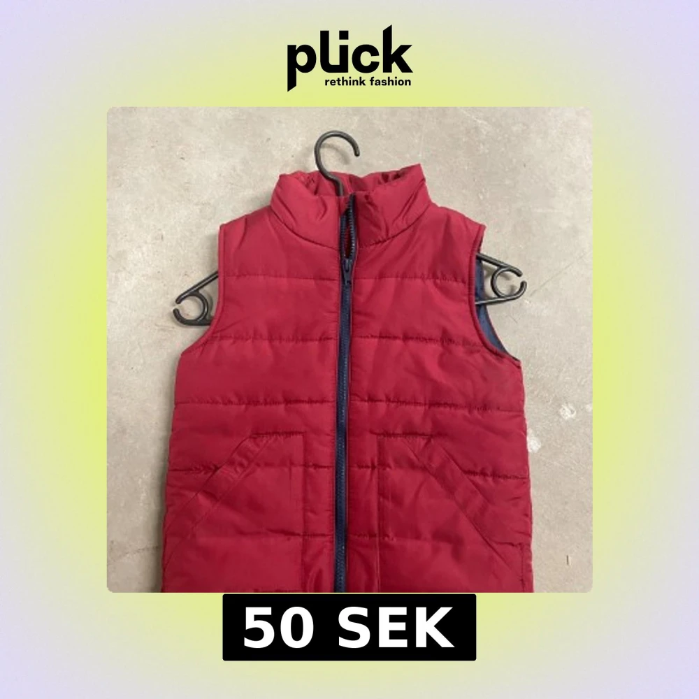 Snygg röd dunväst från H&M med quiltad design och hög krage. Västen har två snedställda fickor framtill och stängs med en mörk dragkedja. Perfekt för lager-på-lager under kyliga dagar.