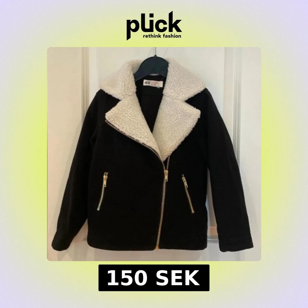 Svart teddyjacka från H&M med stor vit fuskpäls-krage och två snedställda fickor med guldiga dragkedjor. Jackan har en schysst bikerstil och är perfekt för kyliga dagar. Materialet är mjukt och mysigt, och modellen är normal i passformen.