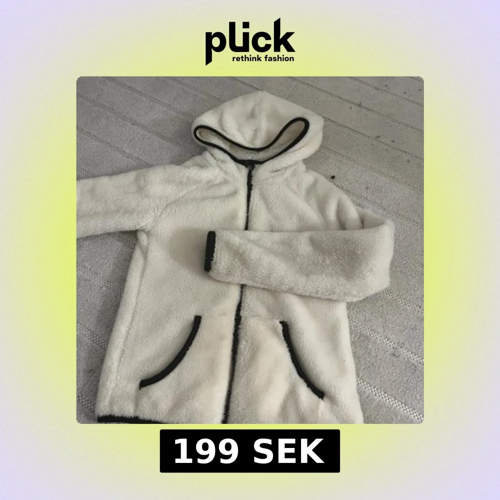 Mysig vit teddyjacka med huva och svarta kantdetaljer vid dragkedja, fickor och ärmslut. Jackan har två framfickor och är helfodrad i fluffigt material. Perfekt för kalla dagar när du vill vara både chill och varm.