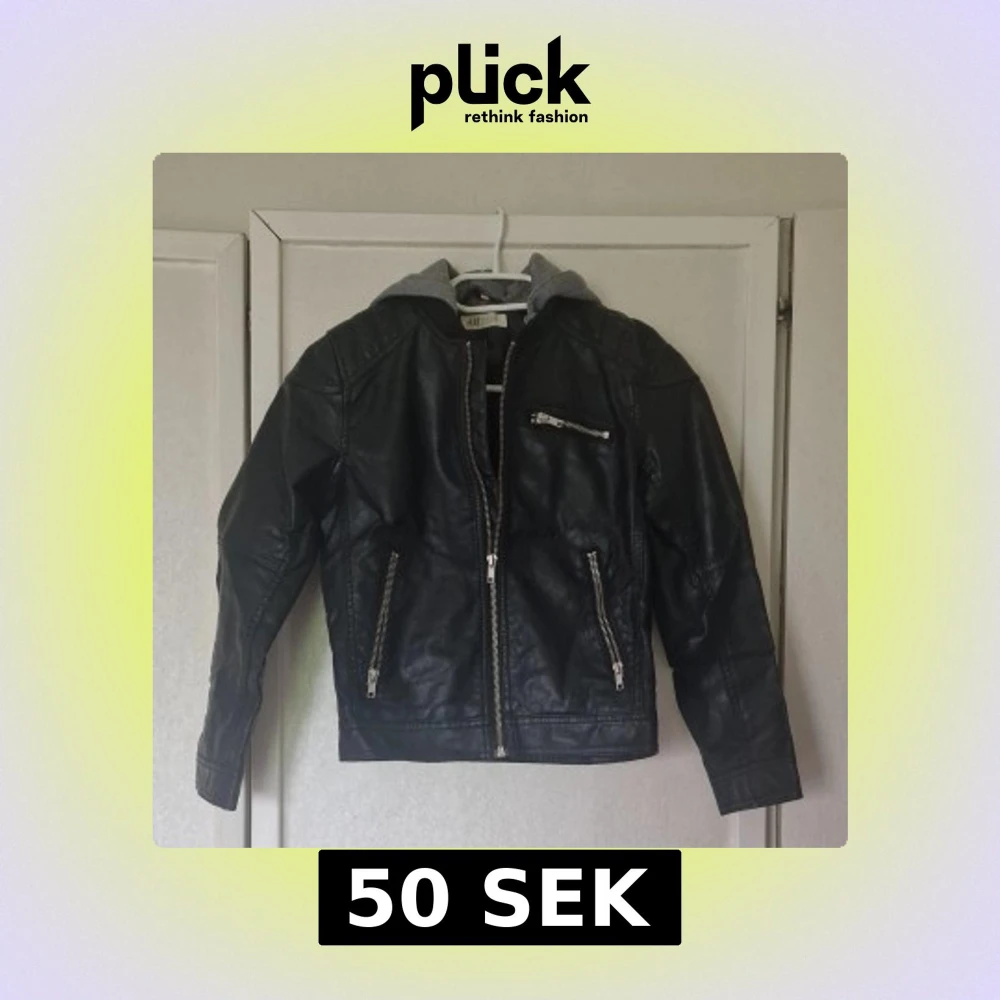 Svart fejkskinnjacka från H&M i storlek 140. Jackan har en grå huva som sitter fast med kardborre, flera dragkedjor framtill och på bröstet samt långa ärmar. Perfekt för dig som vill ha en edgy look med streetkänsla. Den är välanvänd jacka och slitage syns genom att tyget har rispats och på att kragen är nopprig.