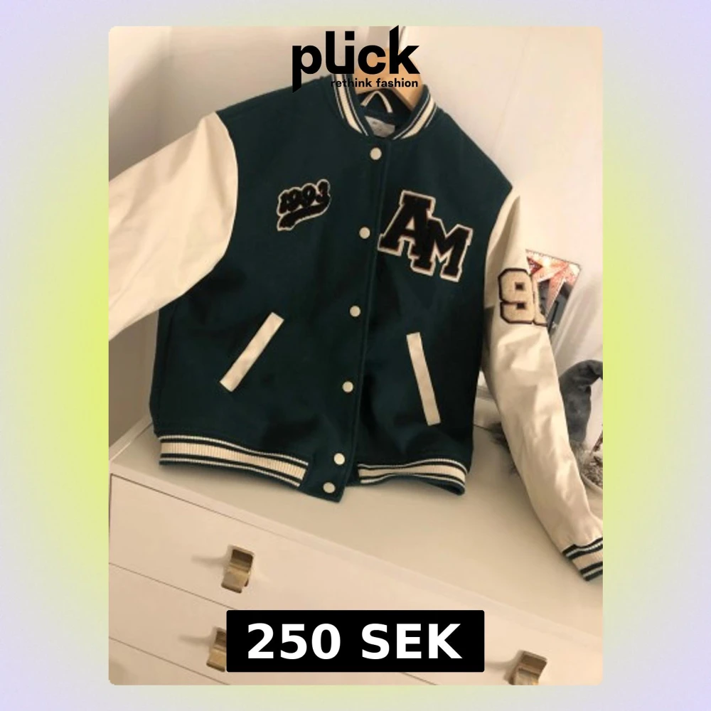 Snygg collegeinspirerad bomberjacka från H&M i mörkgrönt med vita ärmar och detaljer. Jackan har broderade patches med 'AM' och '93' samt randiga muddar och knappar framtill. Perfekt för dig som gillar streetstyle och sportig vibe.