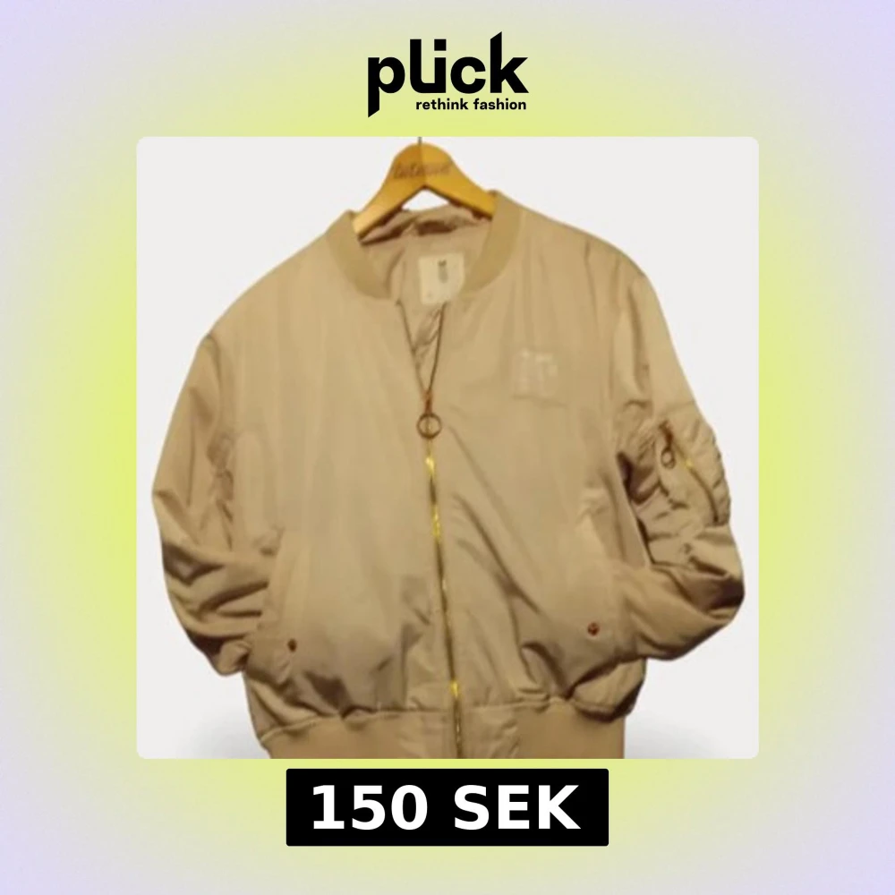 Säljer en beige bomberjacka med klassisk passform och guldfärgad dragkedja framtill. Jackan har ribbade muddar, fickor på sidorna och en ärmficka med dragkedja. Perfekt för dig som vill ha en stilren och trendig look.