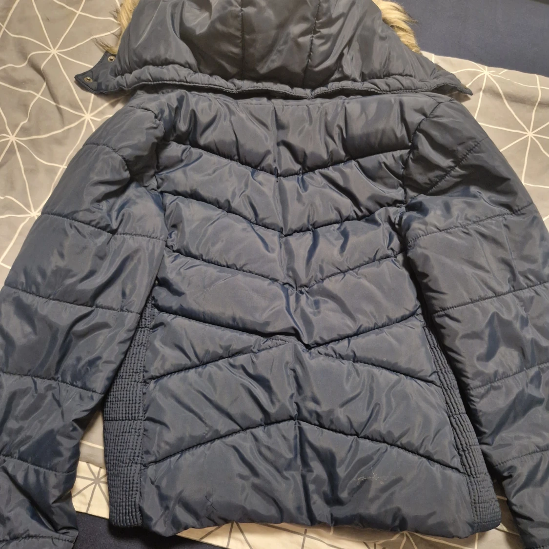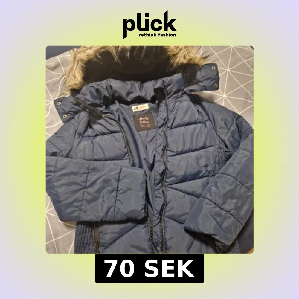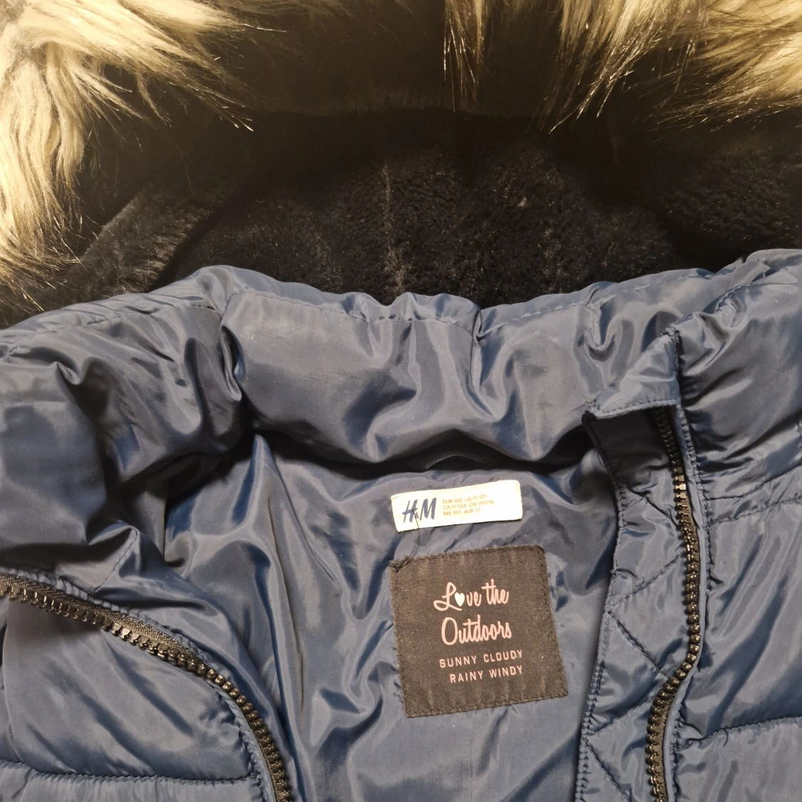 Säljer en blå pufferjacka från H&M med mysig fuskpäls på huvan. Jackan har quiltad design, dragkedja framtill och långa ärmar. Perfekt för kalla dagar och har en snygg, sportig look.