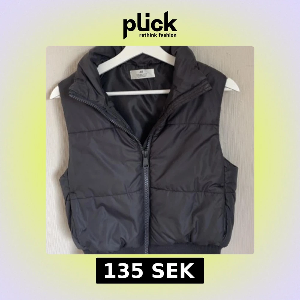 Svart dunväst från H&M i storlek 158. Västen har en hög krage, breda kanaler och dragkedja framtill. Den är quiltad och har ribbad nederkant för extra komfort. Perfekt att slänga över en hoodie när det är kyligt ute.