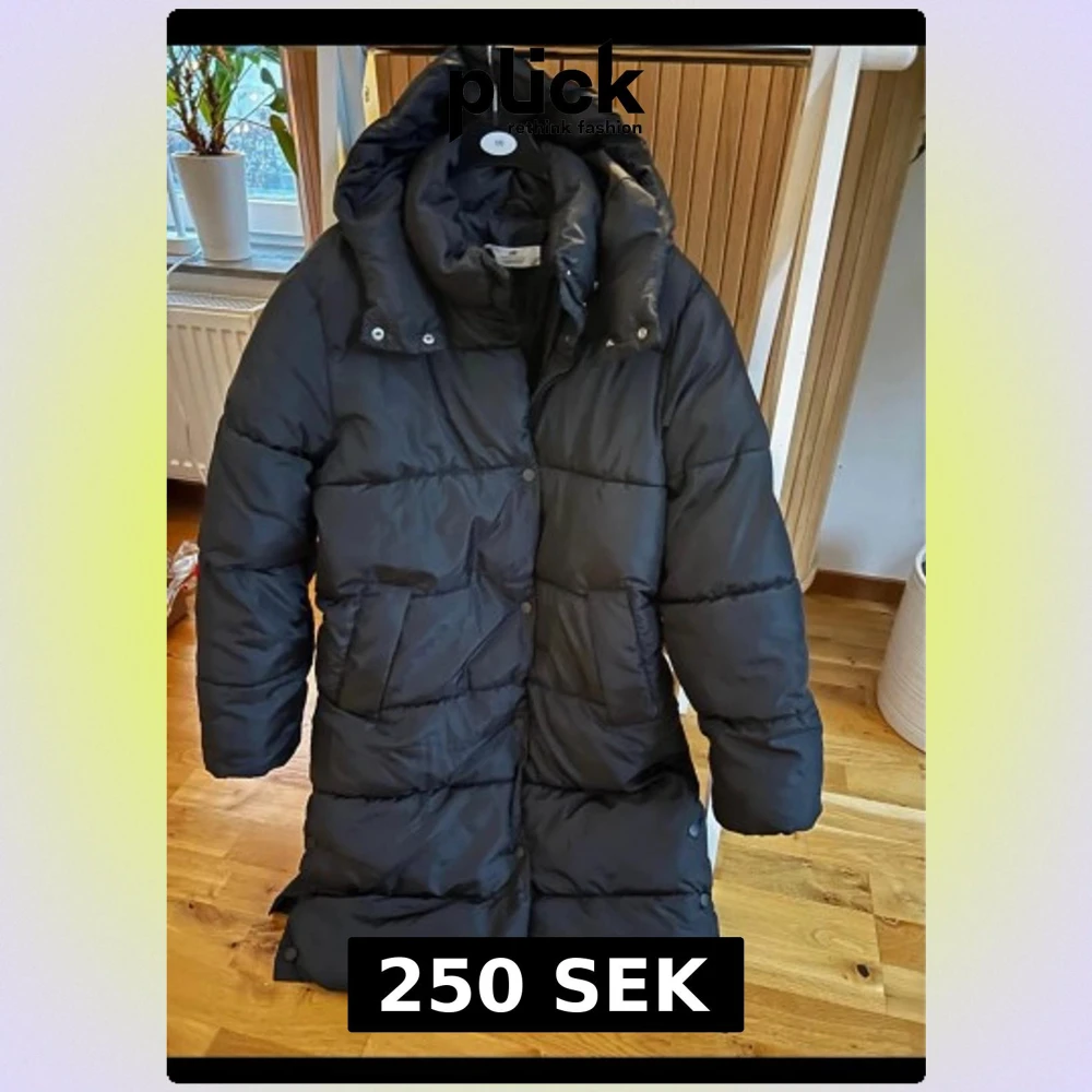 Säljer en svart lång pufferjacka från H&M med stor huva och rejäla fickor. Jackan har quiltad design, tryckknappar och dragkedja framtill. Perfekt för kalla dagar och har en riktigt chill oversized vibe.