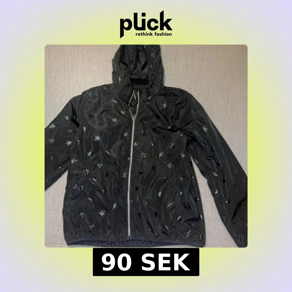 Svart vindjacka från H&M med reflekterande stjärnmönster över hela jackan. Jackan har huva, dragkedja framtill och två fickor. Perfekt för dig som vill sticka ut lite extra när du är ute. Materialet är lätt och känns smidigt.
