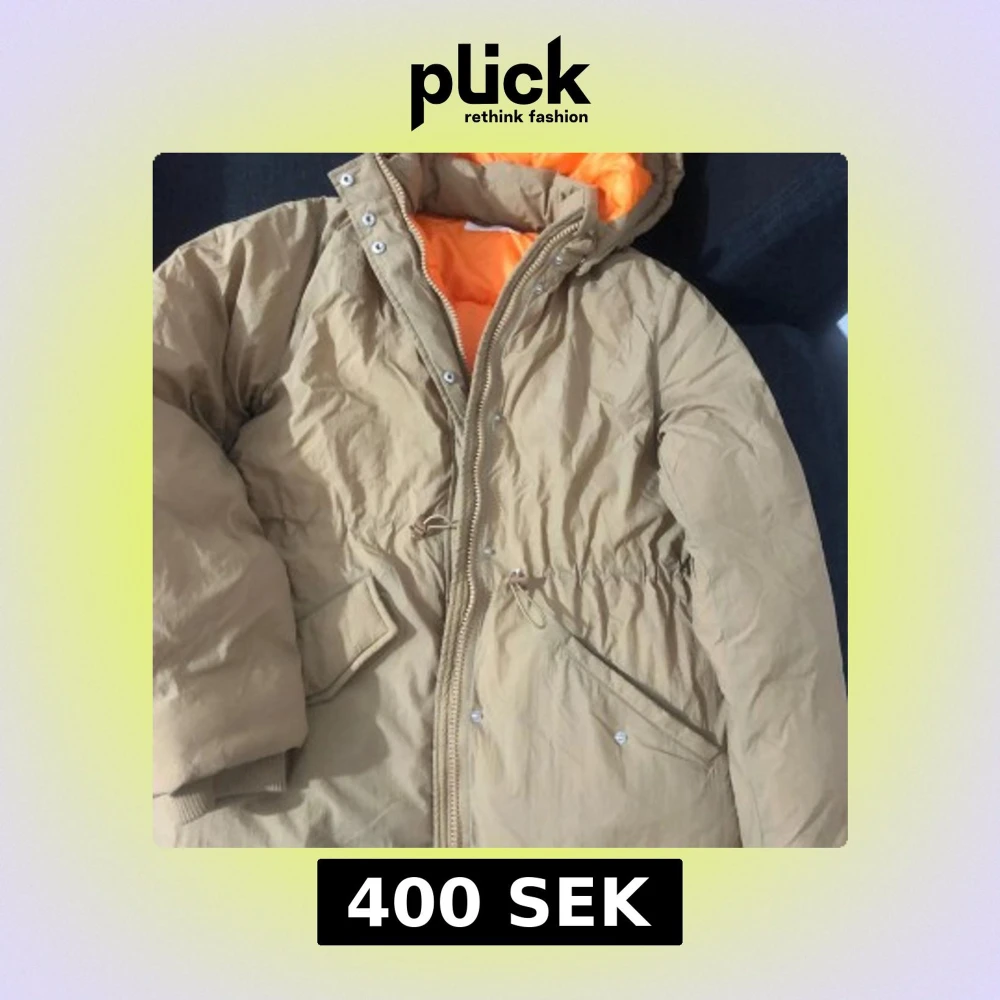 Säljer en beige parkajacka från H&M med snyggt orange foder. Jackan har huva, dragkedja och knappar framtill, samt snörning i midjan för bättre passform. Perfekt för kyliga dagar och har praktiska fickor med lock. Storlek på bilderna