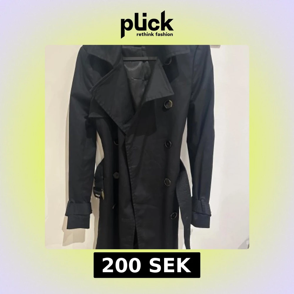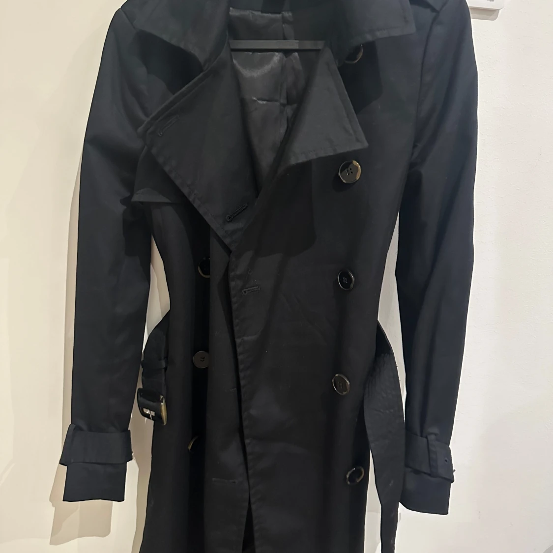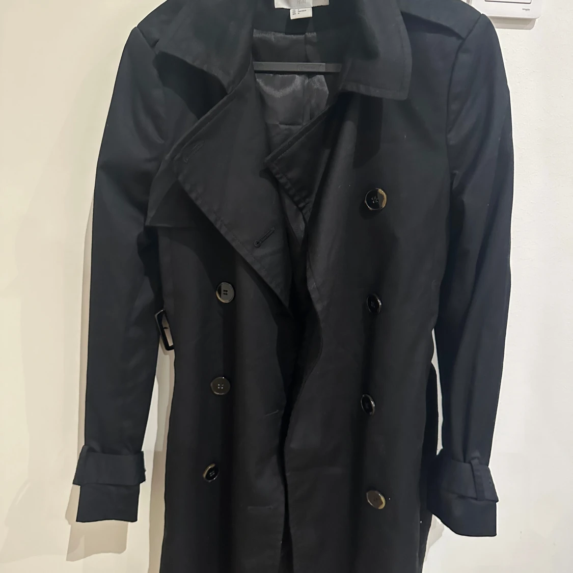Stilren svart trenchcoat från H&M med dubbelknäppning, klassisk krage och bälte i midjan. Jackan har långa ärmar med spänndetaljer vid ärmsluten och stora knappar framtill. Perfekt för dig som vill ha en tidlös och snygg look.