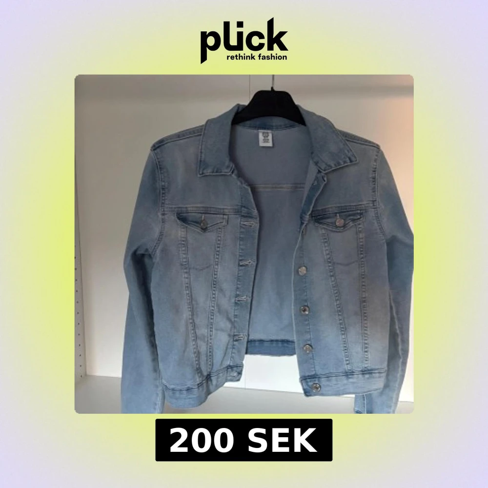 Säljer en klassisk ljusblå jeansjacka från H&M. Jackan har knappar framtill, två bröstfickor med lock och knapp samt klassisk krage. Perfekt för vår och sommar, enkel att styla till olika outfits.