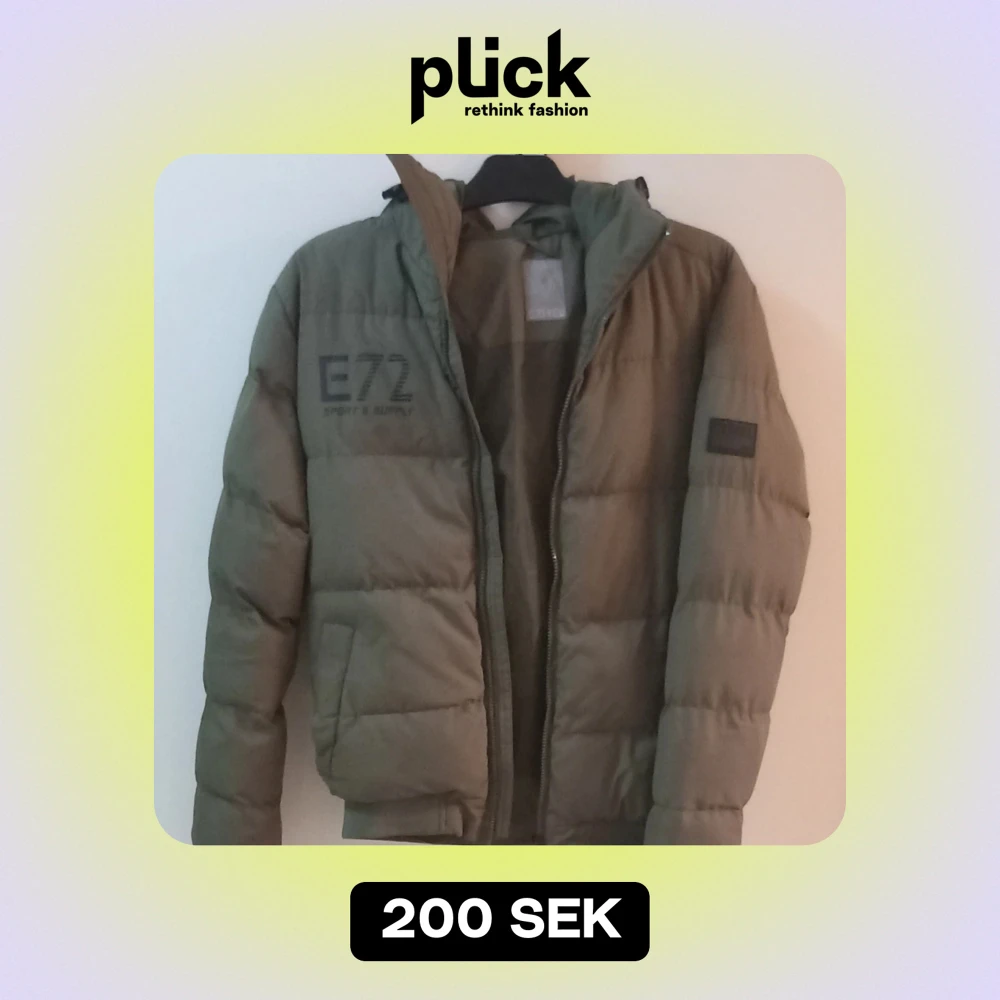 Säljer en olivgrön pufferjacka med trycket 'E72' på bröstet. Jackan har en dragkedja framtill och är perfekt för kyliga dagar. Den är i bra skick och passar både till vardags och lite mer avslappnade tillfällen. Supermysig och varm!