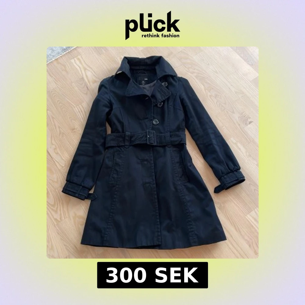Stilren svart trenchcoat från H&M i storlek 34. Jackan har klassisk krage, knappar framtill och ett matchande bälte i midjan. Långa ärmar med spänndetaljer vid handlederna och två fickor framtill. Lite Jackie Onasis stil.