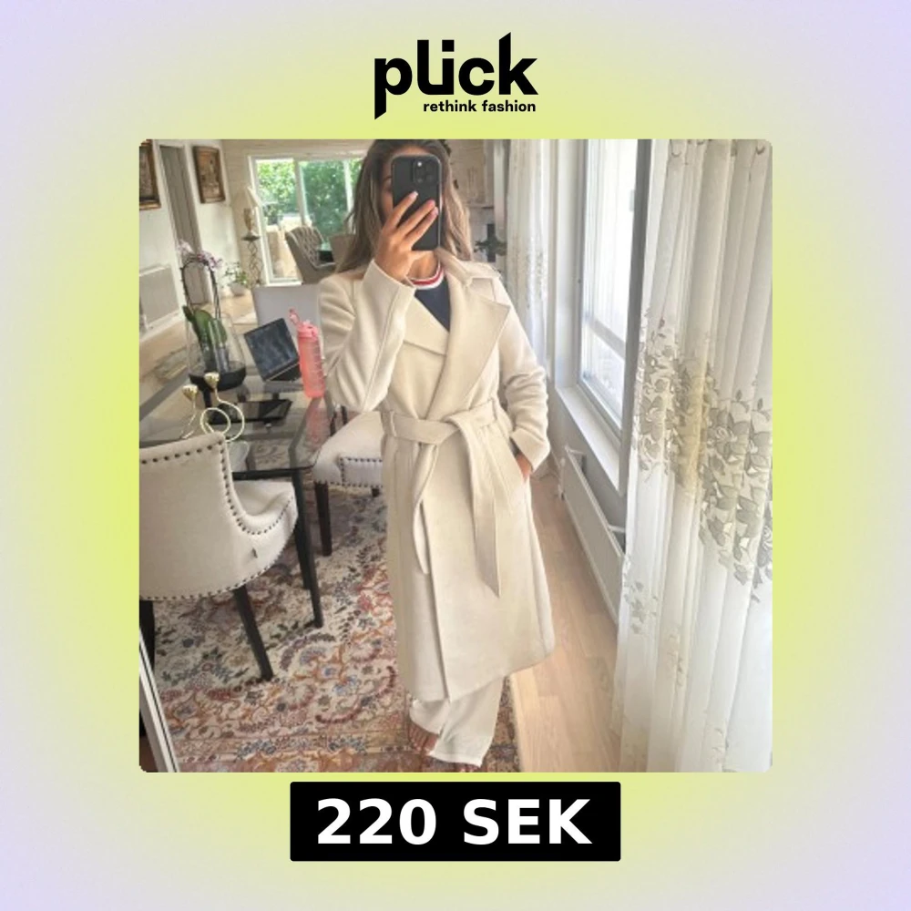 Snygg beige kappa med klassiska slag och bälte i midjan. Lång modell med knappar framtill och slits bak. Perfekt för dig som vill ha en stilren och tidlös look. Passar till allt och är superenkel att styla. Använd men ej trasig eller sliten. Tjocktröja får plats under