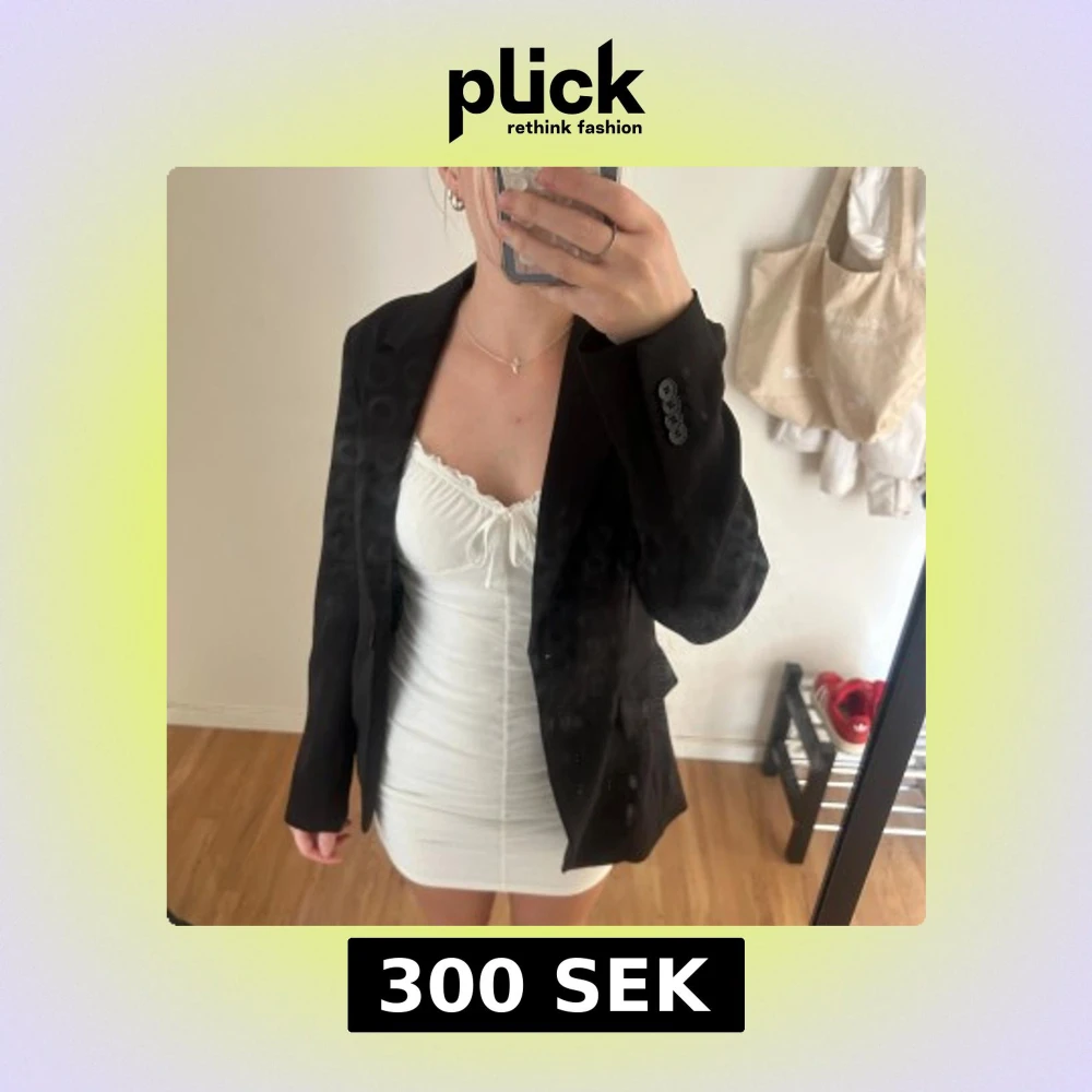 Snygg svart kavaj från H&M i storlek 34. Klassisk modell med krage, knappar vid ärmslut och fickdetaljer framtill. Perfekt att slänga över en klänning eller till jeans för en clean look. Materialet är mjukt och har en lätt glansig finish.