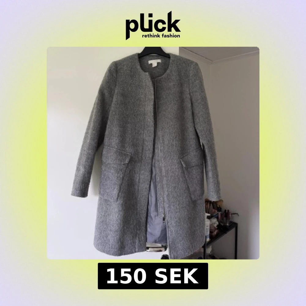 Säljer en stilren grå kappa från H&M i storlek 36. Kappan är tillverkad i ullmaterial, har lång ärm, rund halsringning och praktiska fickor framtill. Stängs med dragkedja och har en enkel, modern look som passar till många outfits.