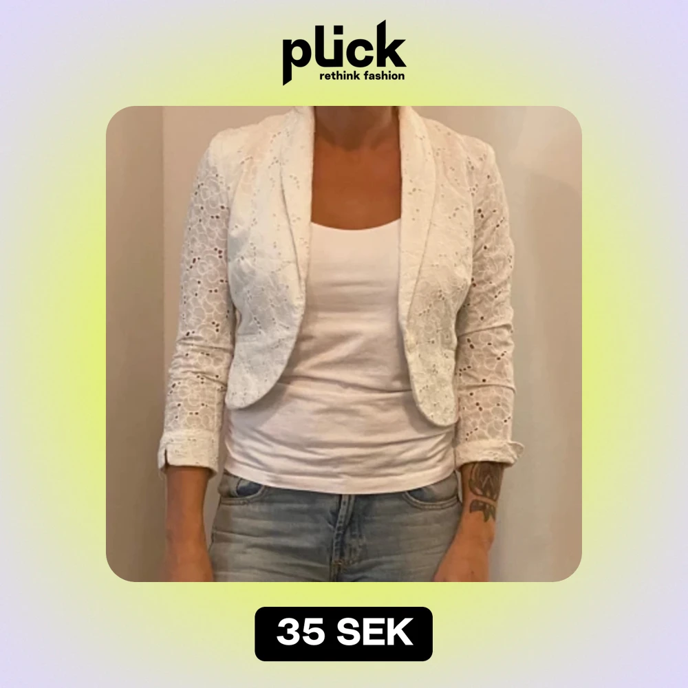 Säljer en superfin vit spetskavaj från H&M i storlek 36. Den har trekvartsärmar och ett snyggt broderat mönster. Perfekt för vår och sommar, både till vardags och fest. Kavajen är i bra skick och ger en fräsch look till vilken outfit som helst!