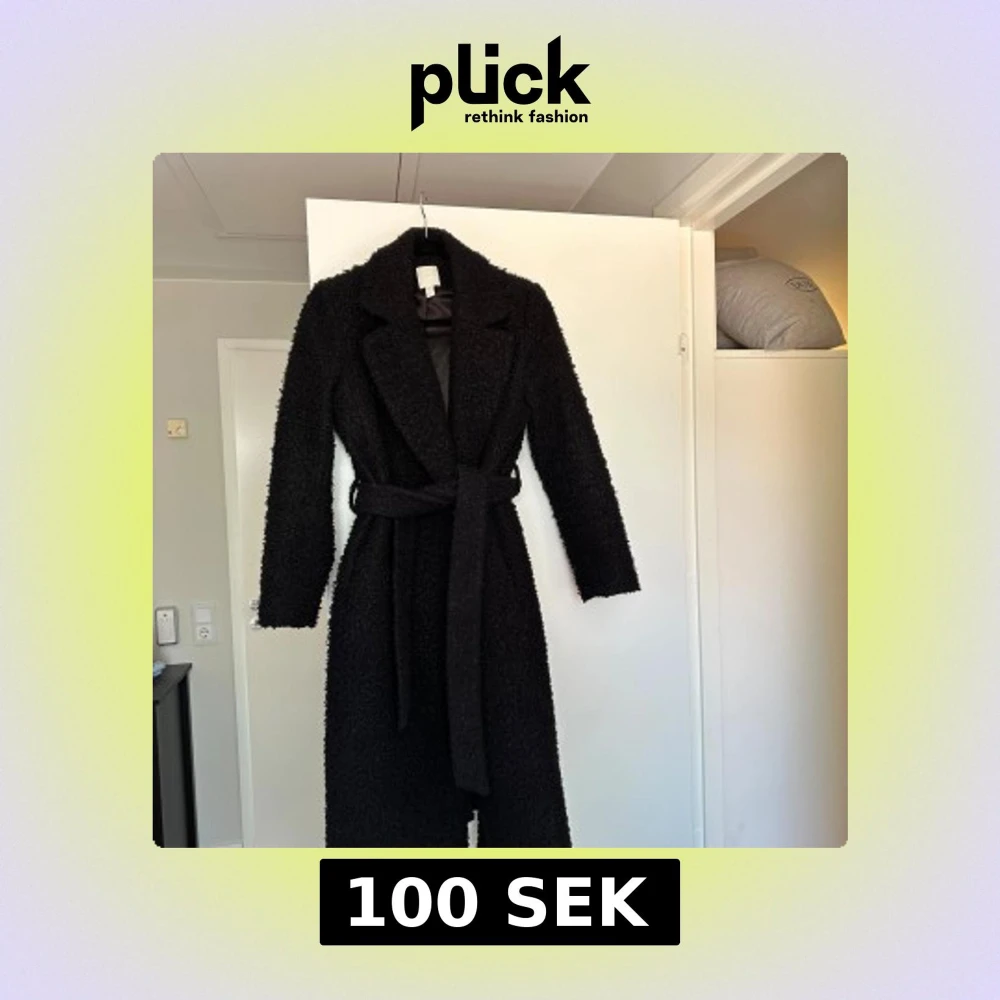 Lång svart teddyrock från H&M i storlek 36. Jackan har en fluffig textur, klassisk krage och knyts med bälte i midjan. Perfekt för dig som vill ha en stilren och mysig look under kyliga dagar.