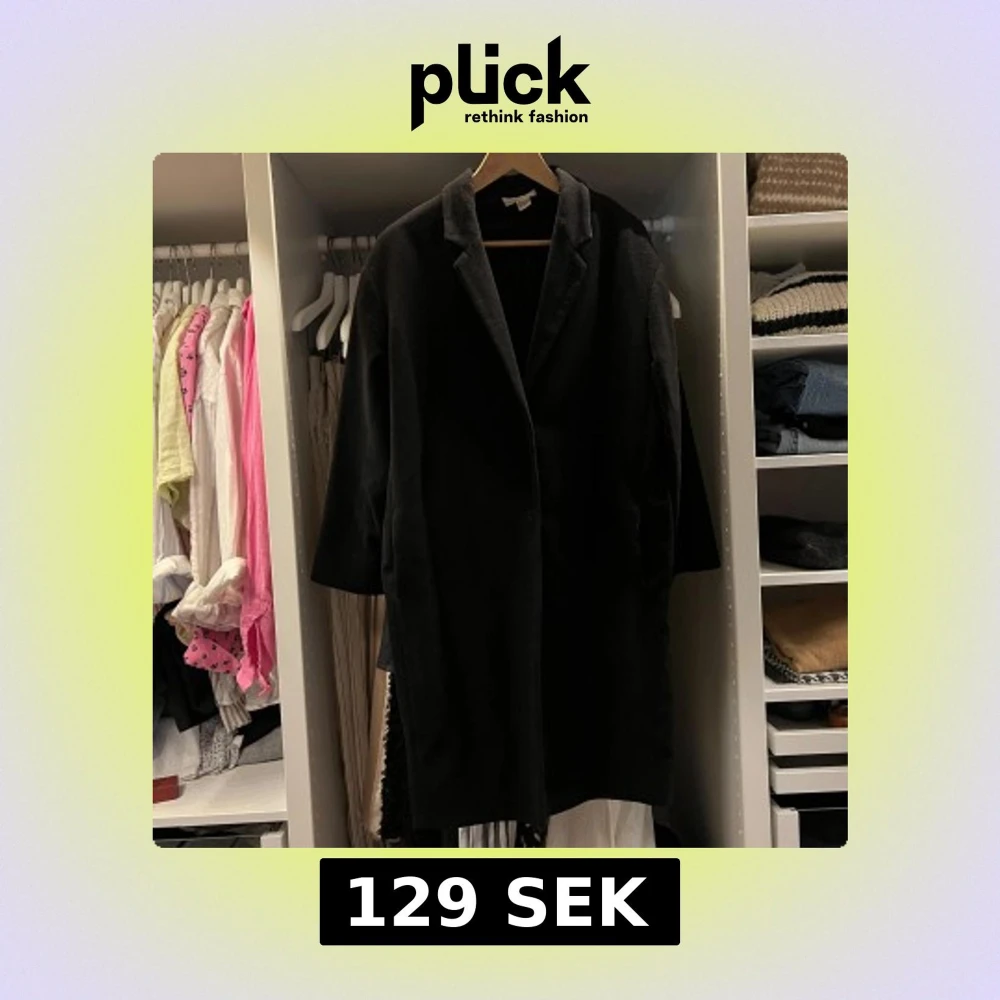Stilren svart kappa med klassisk krage och dolda fickor. Rak och lite oversized passform, perfekt för lager-på-lager. Materialet är mjukt och känns lyxigt, troligtvis ullblandning. Enkel design som funkar till allt och ger en clean look. Den är använd och fickorna har slitage som syns på bild men inget jag har tänkt på stör mig vid daglig användning. Minns inte vad jag köpte den för men säljer för lågt pris för en ullblandningskappa.