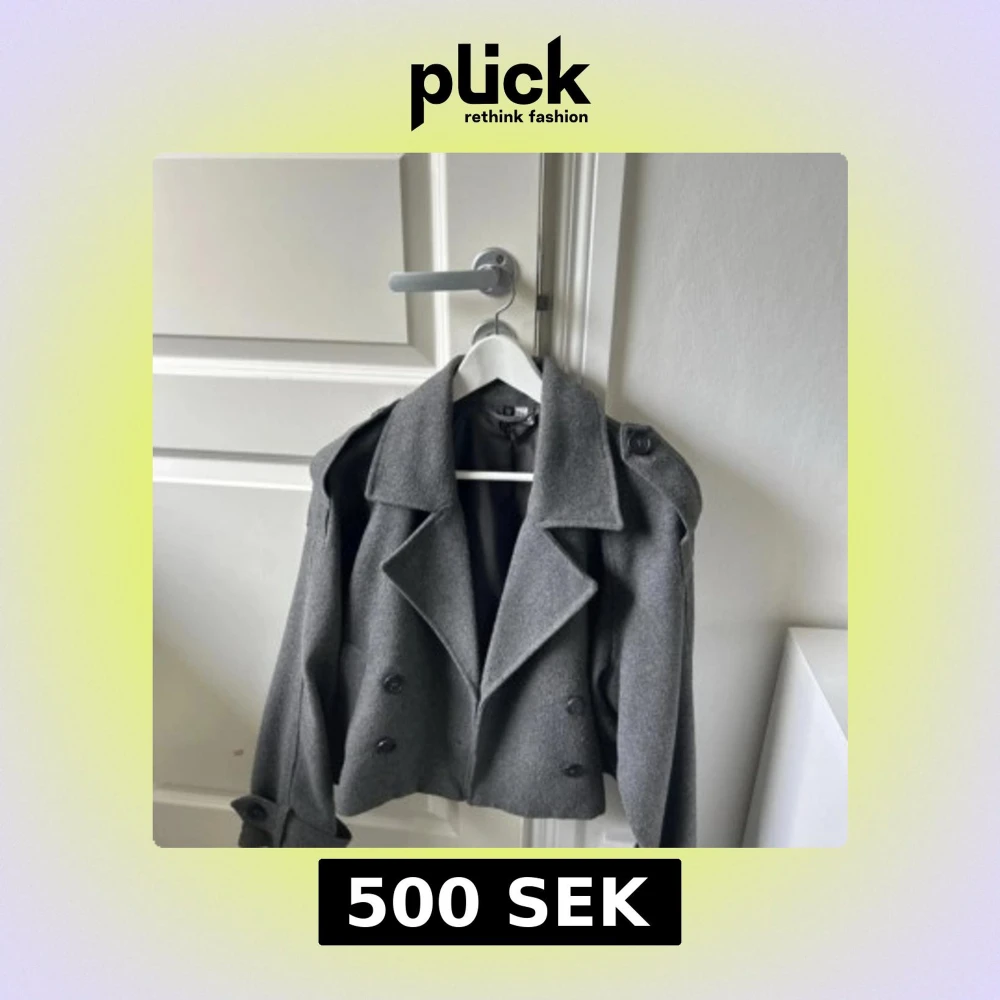 Snygg grå skepparkavaj från H&M med dubbelknäppning, breda slag och axelklaffar. Jackan är croppad och har stora knappar samt dekorativa detaljer vid ärmsluten. Perfekt för dig som vill ha en stilren och trendig look.