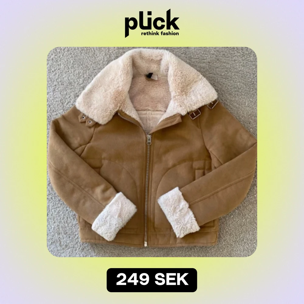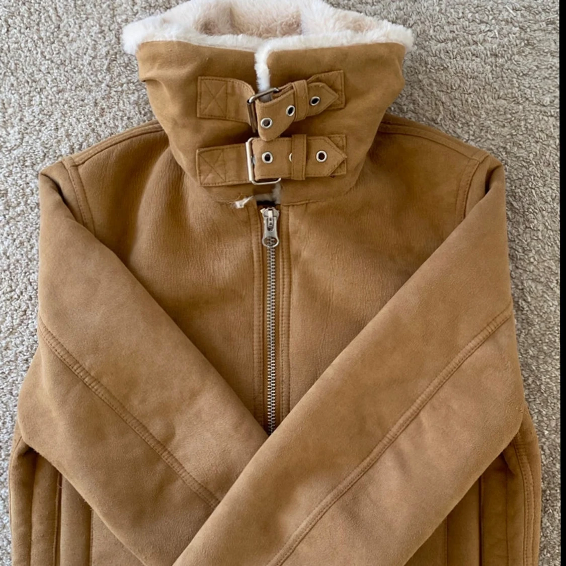 Ljusbrun mocha jacka med vita luddiga muddar. Luddig på hela insidan och därför varm. Storlek:36