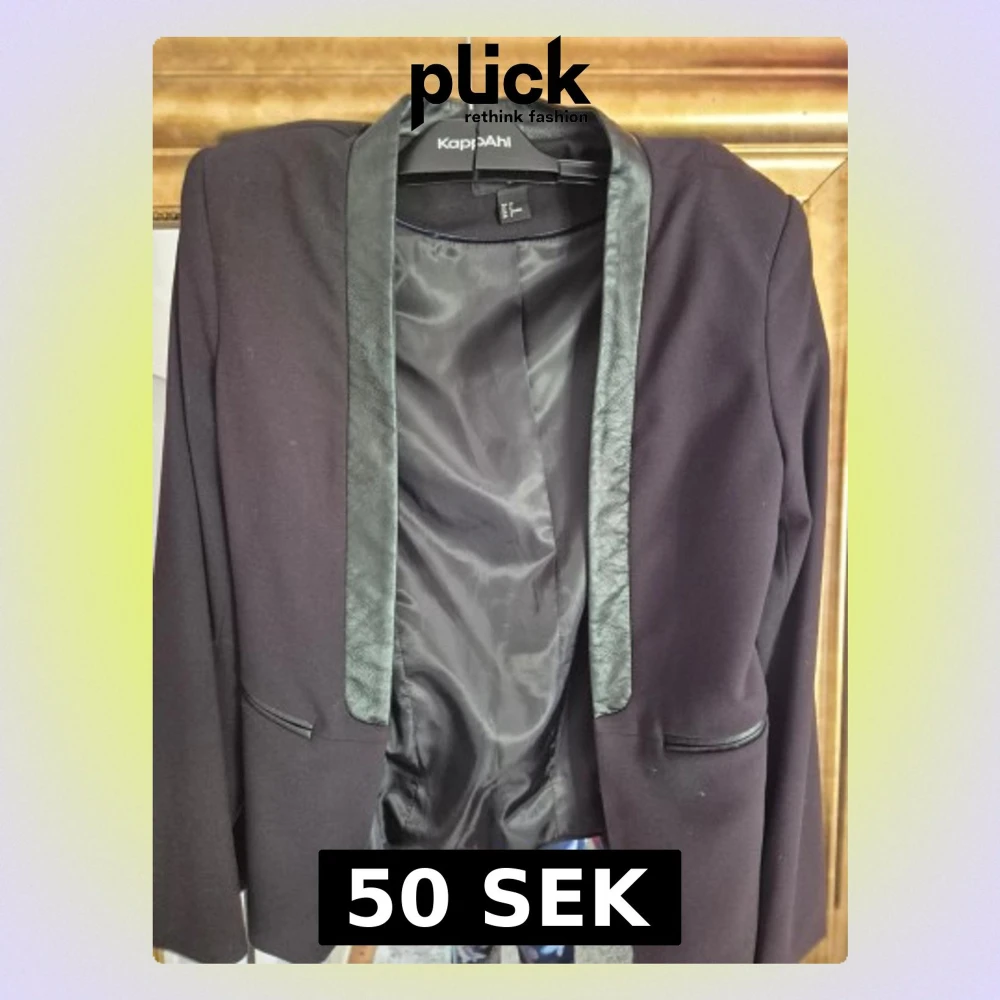 Svart kavaj från HM med snygga detaljer i skinn på kragen och fickorna. Klassisk rak passform och långärmad design. Perfekt för dig som gillar stilrena plagg med en liten edge. Materialet är mjukt och känns bekvämt mot kroppen.