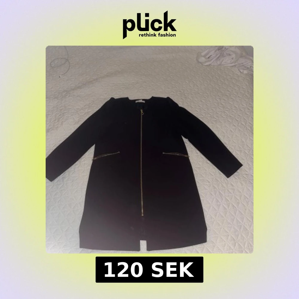 Svart rock från H&M i stilren design med guldfärgade dragkedjor både framtill och vid fickorna. Jackan har rundad hals, lång ärm och är fodrad med slätt tyg på insidan. Perfekt för dig som gillar minimalistisk och snygg look.