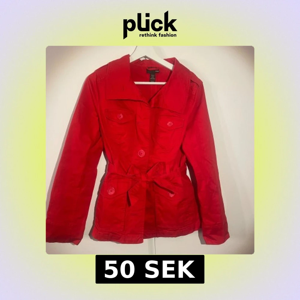 Riktigt snygg röd jacka från H&M med markerad midja tack vare bälte. Jackan har stora knappar framtill, fyra fickor med lock och klassisk krage. Perfekt för dig som vill sticka ut med färg och stil. Långärmad och i mjuk bomull.