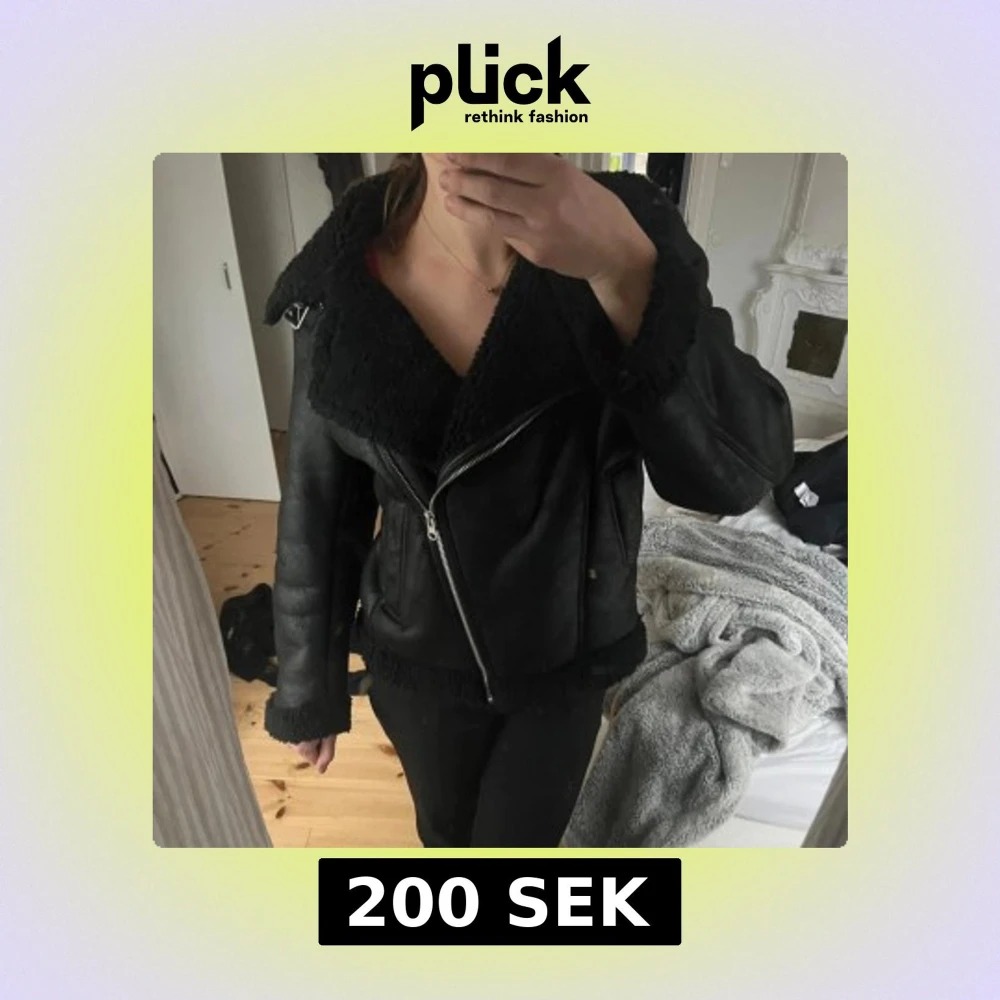Säljer en svart teddyjacka med bred krage och mysigt foder. Jackan har en cool bikerstil med sned dragkedja, stora fickor och detaljer i metall. Perfekt för kalla dagar när du vill vara både varm och snygg.