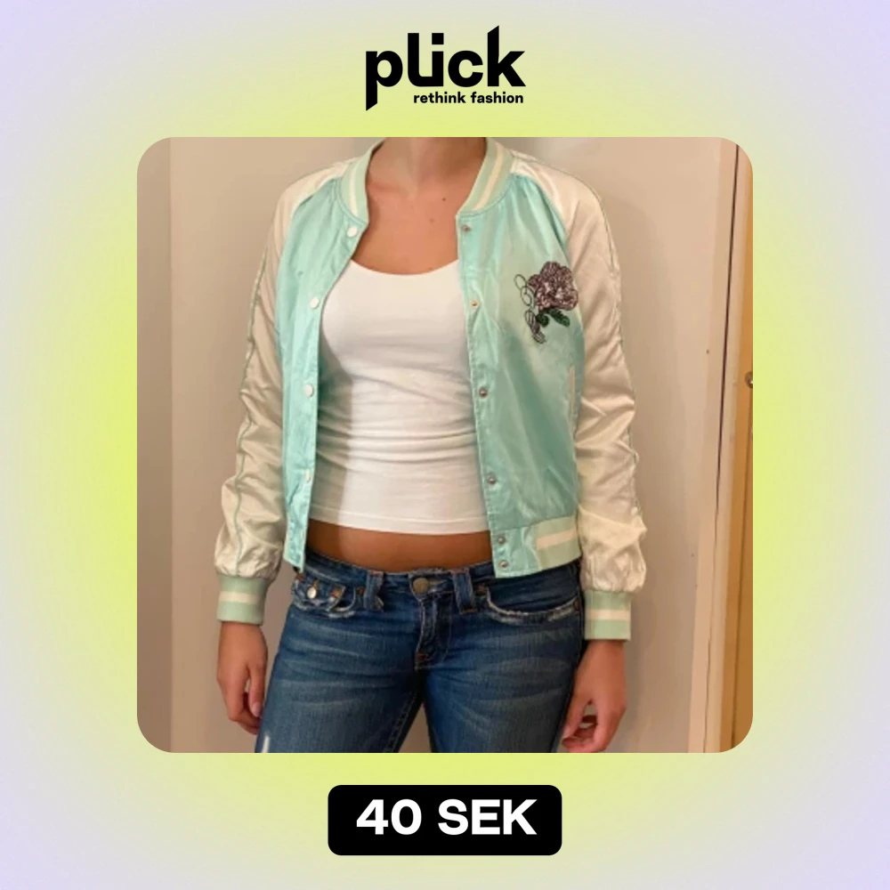 Säljer en superfin mintgrön bomberjacka från H&M. Den har ett snyggt blommigt broderi på bröstet och ryggen. Jackan är i satinmaterial och har långa ärmar med ribbade muddar. Perfekt för vår och sommar! 🌸