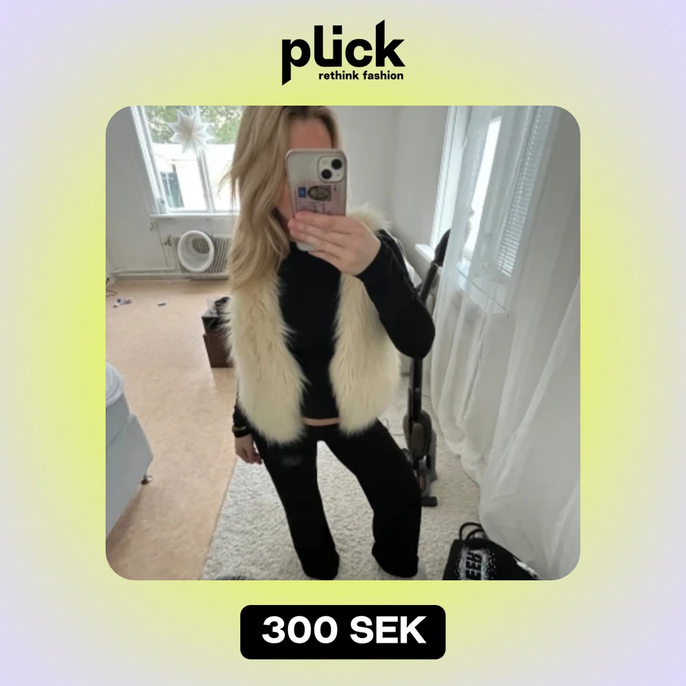 Svinsnygg pälsväst, går att stänga med ett fäste på mitten.