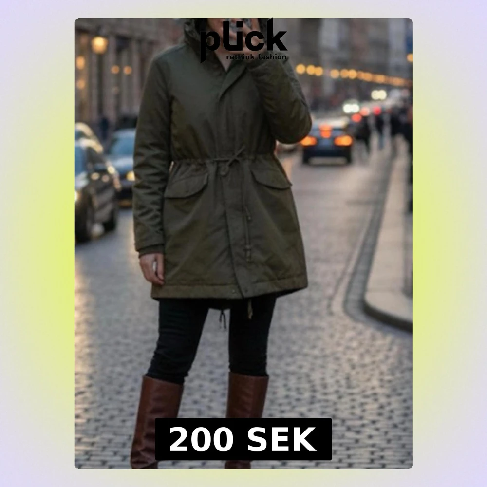 Säljer en olivgrön parkasjacka med huva och snörning i midjan för en snygg siluett. Jackan har stora fickor framtill och stängs med dragkedja och knappar. Perfekt för kyliga dagar och enkel att styla till olika outfits.
