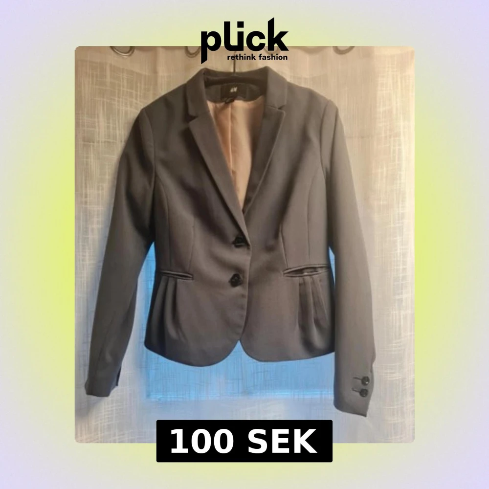 Snygg grå kavaj från H&M i storlek 44. Klassisk modell med två knappar framtill, figursydd passform och diskreta fickor. Fodret är ljusrosa med små prickar.