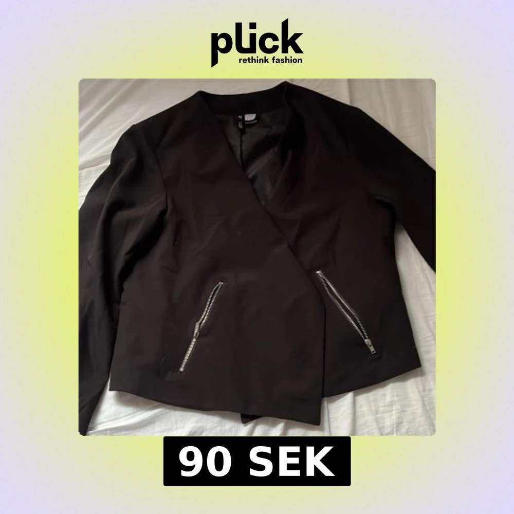 Säljer en svart kavaj från H&M med två sneda dragkedjor framtill. Jackan har lång ärm och en stilren, minimalistisk design utan synliga knappar. Perfekt för dig som gillar en modern och enkel look.