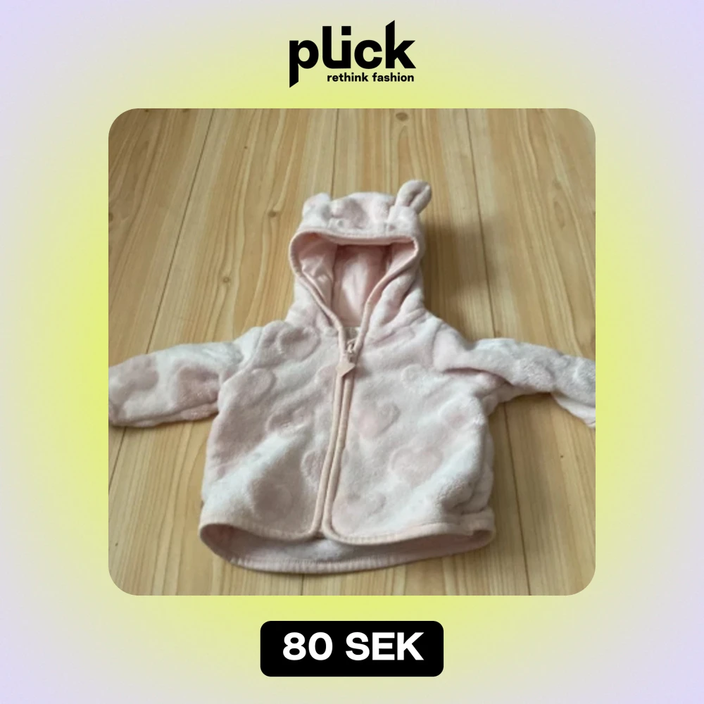 Supergullig rosa fleecejacka för barn med huva som har små öron. Jackan har ett hjärtmönster och dragkedja framtill. Perfekt för att hålla sig varm och mysig under kyliga dagar!