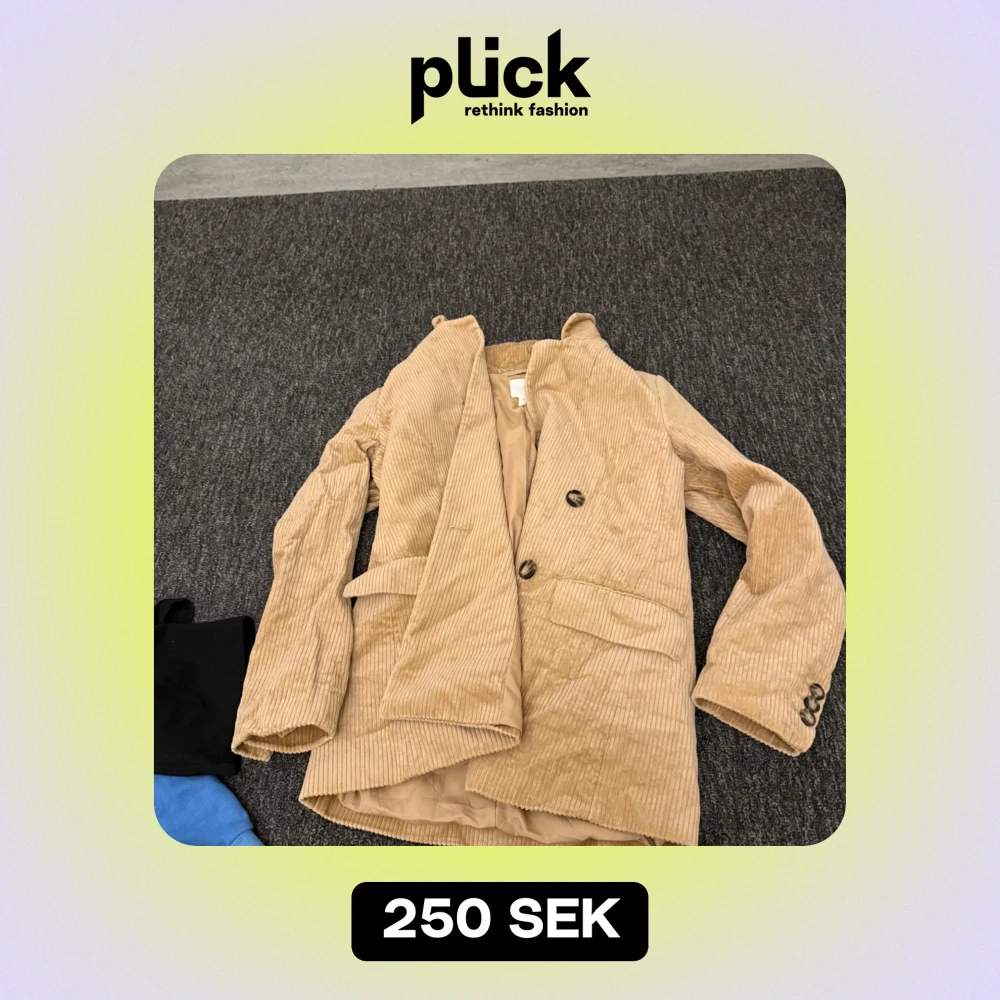 Säljer en snygg beige manchesterkavaj från H&M. Kavajen har en klassisk design med två knappar framtill och långa ärmar. Perfekt för en stilren look.